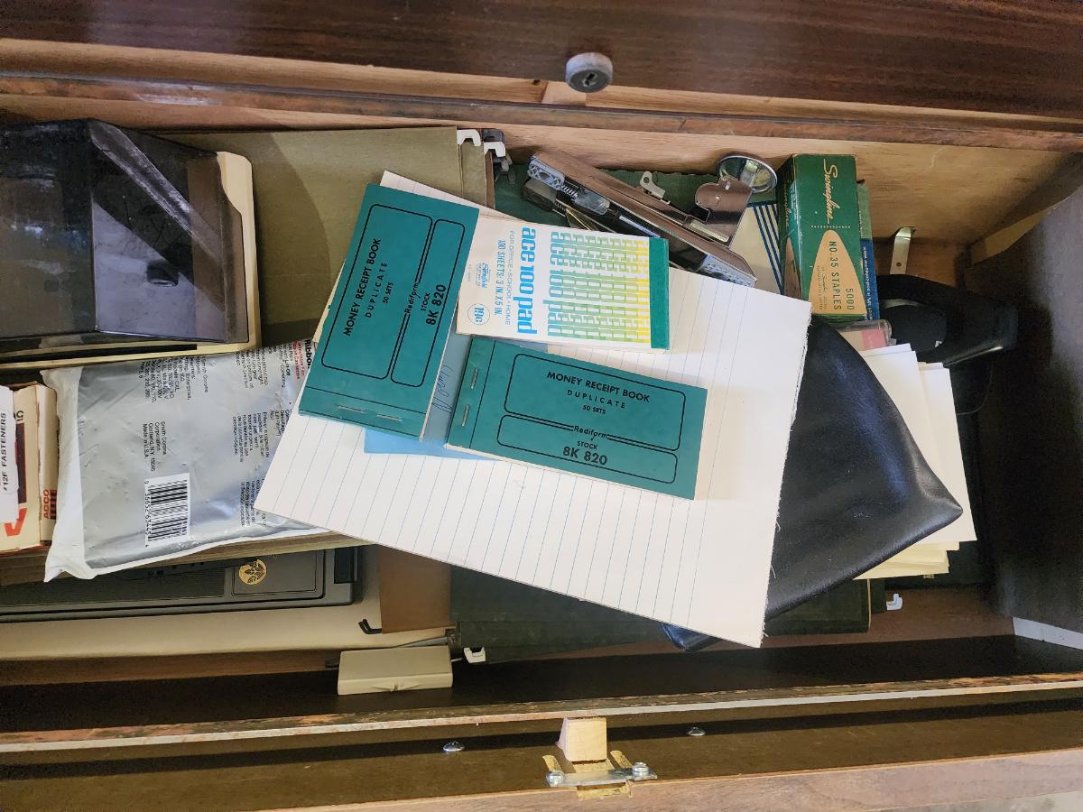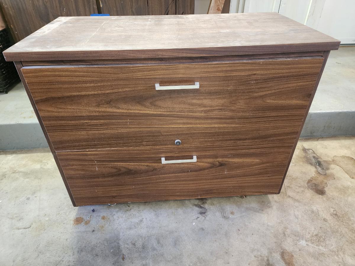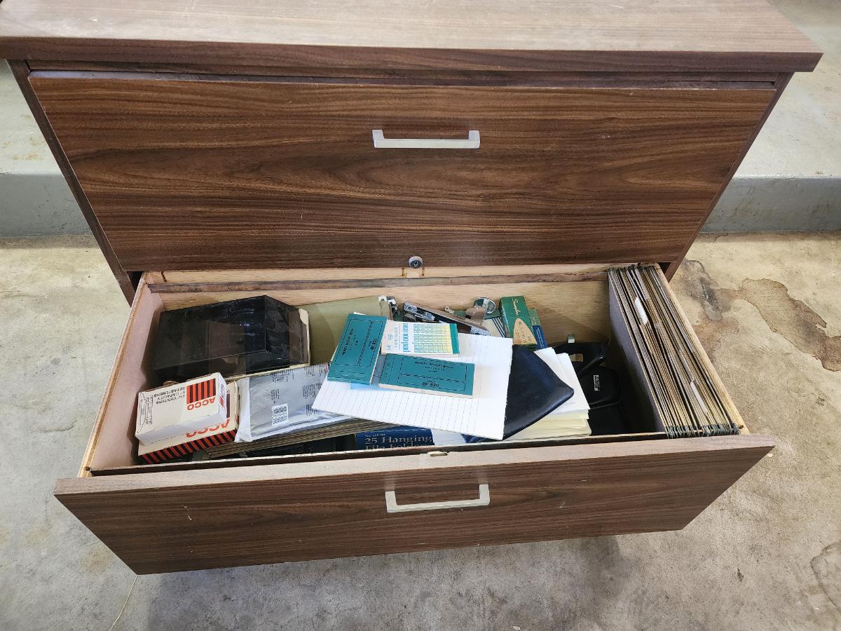 2 Drawer laminated lateral file cabinet w/office supplies included 38"W x 29"H x 19"D