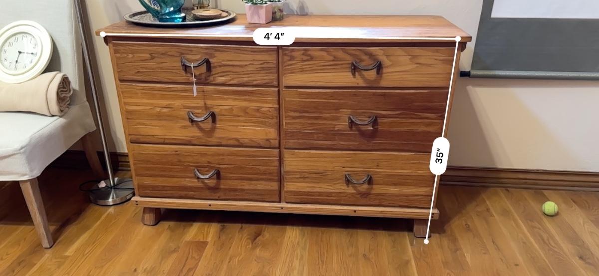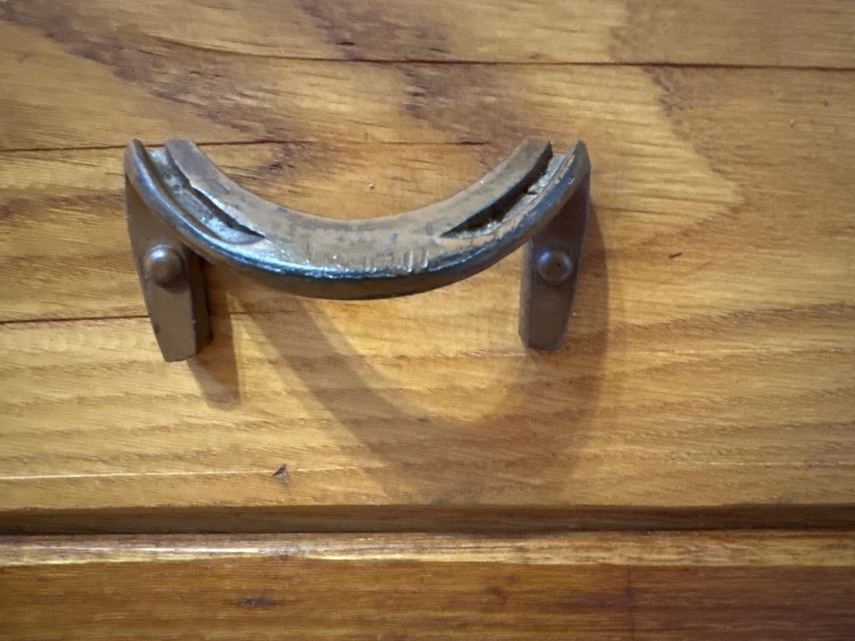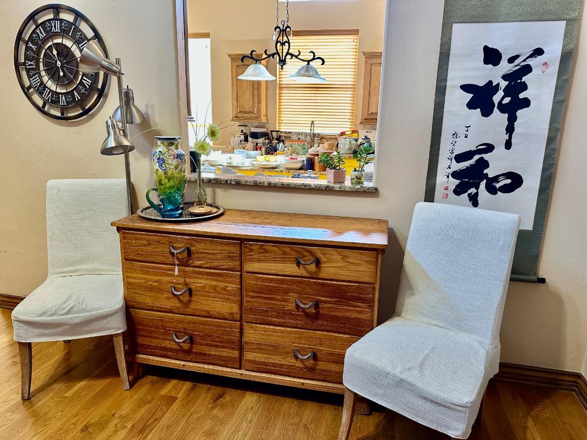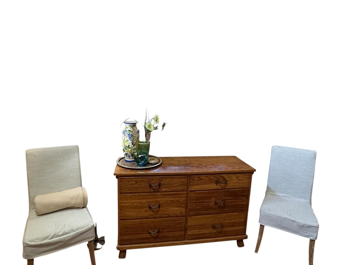 Furniture -Ranch Oak 6 drawer dresser (has horseshoe pulls) and 2 parsons chairs plus decor