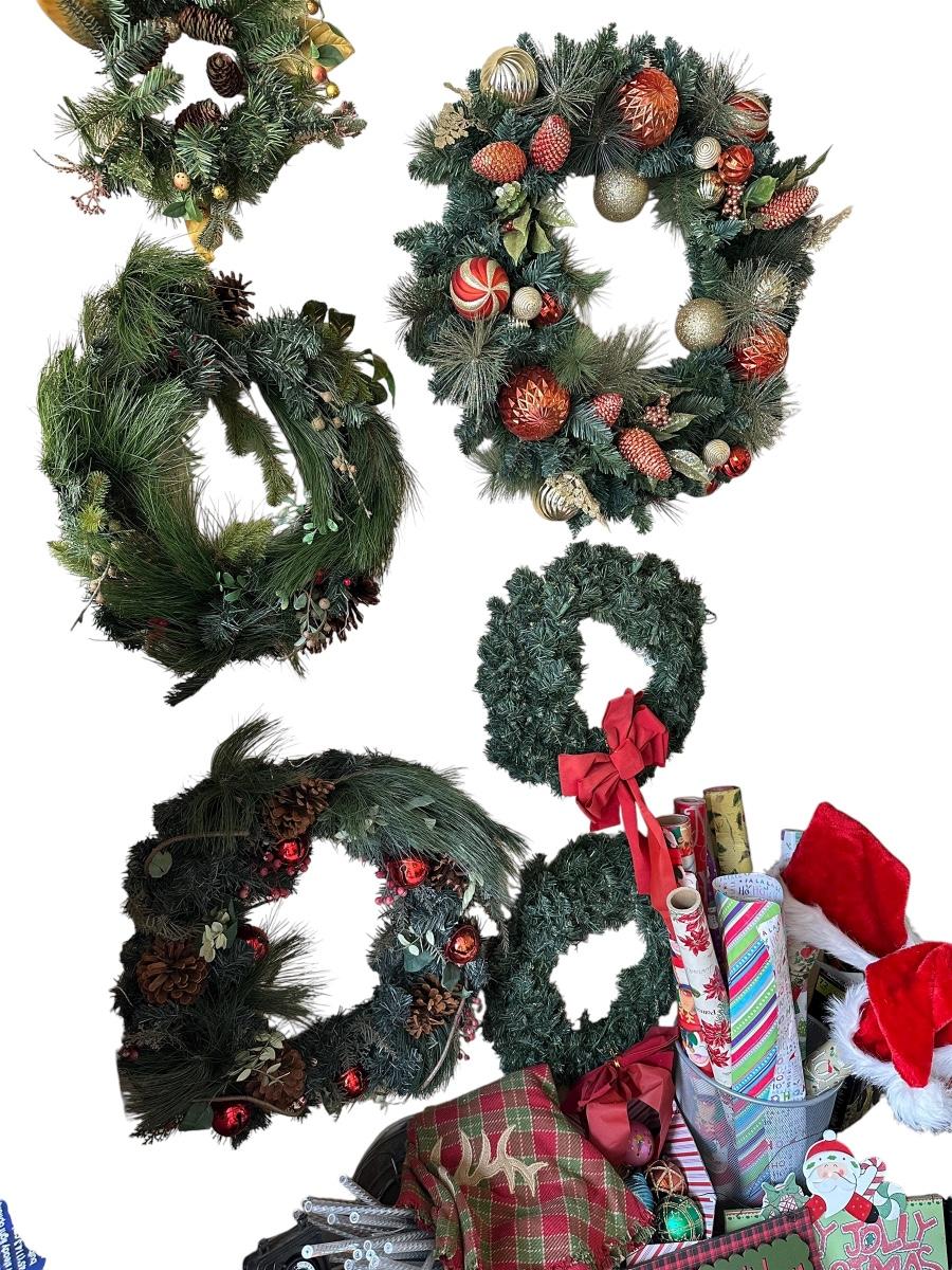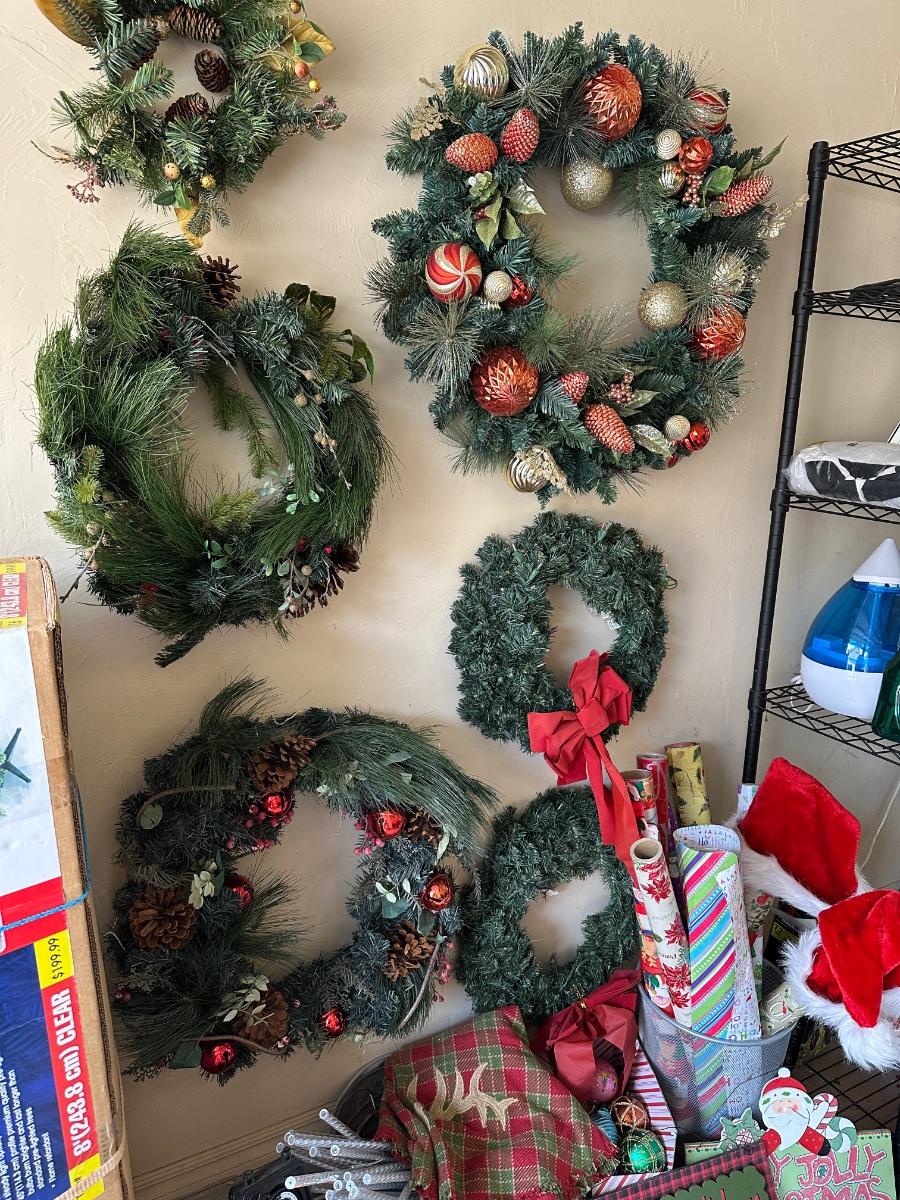 There is a selection of wreaths in this Online sale. You are bidding on all the items in the photo. Everything in the photo is included except any displays and items used for sizing. We do not have time to measure individual items