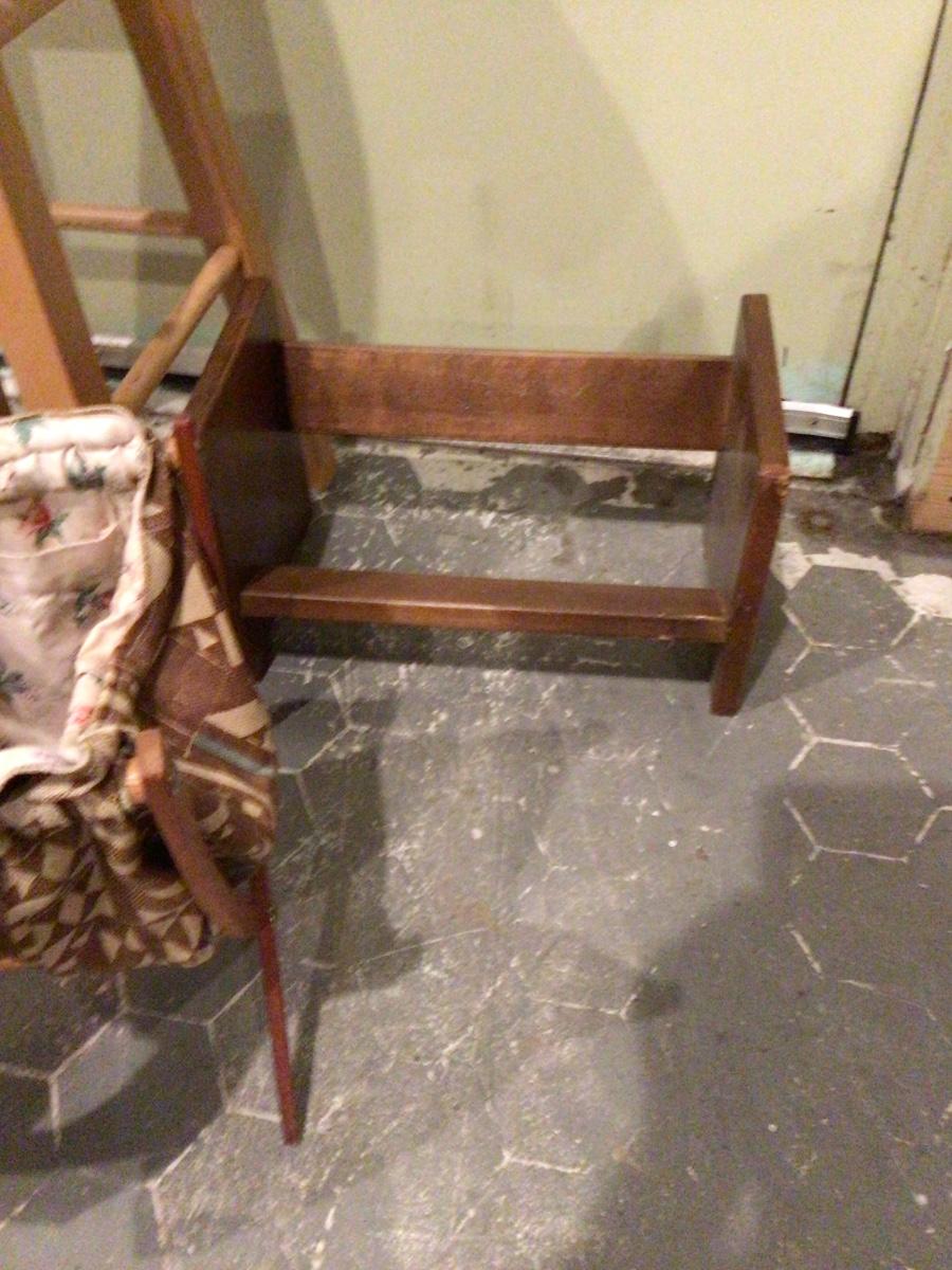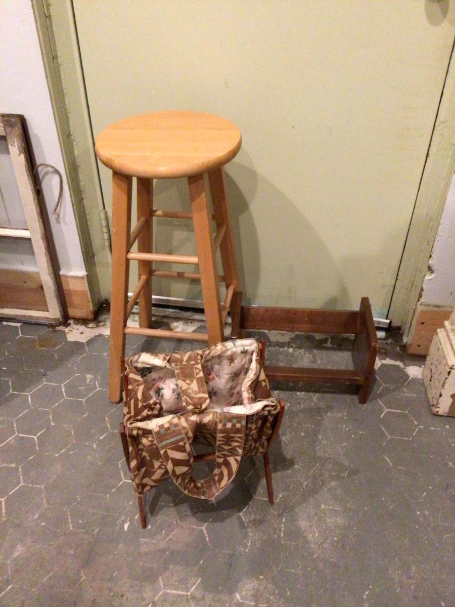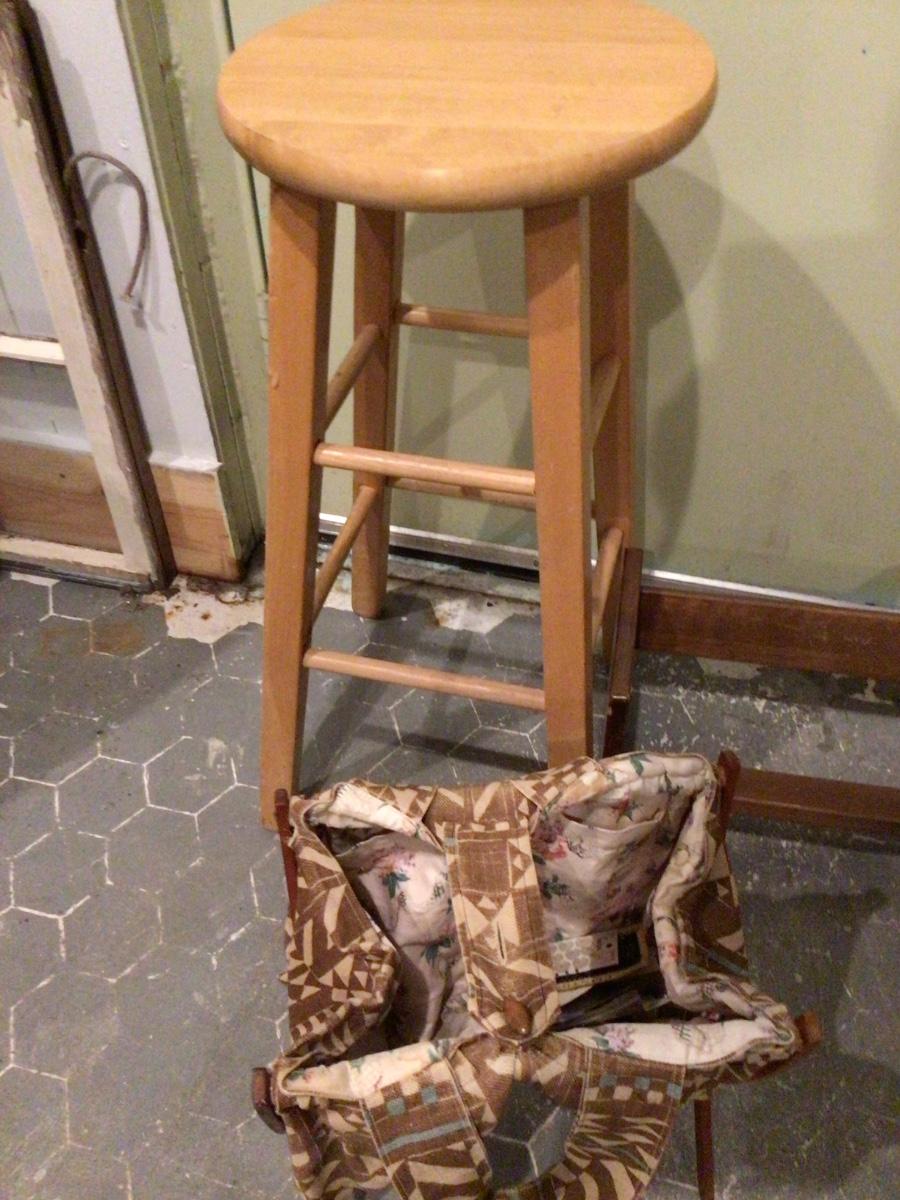 You get wood stool, wood book holder, wood and cloth sewing kit.