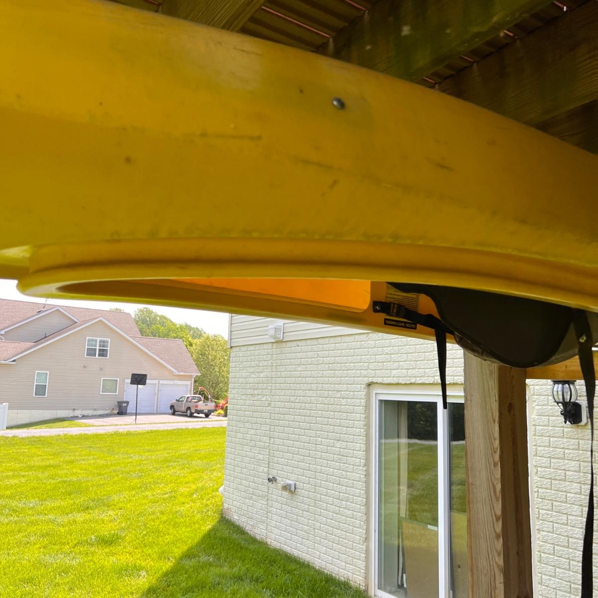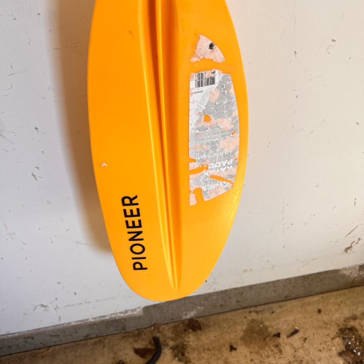 1 Yellow Fusion kayak and 1 yellow pioneer paddle. See pics for condition. Seat cushion half detached. Comes with paddle. Green kayak in picture is also for sale. See lot ID "green"