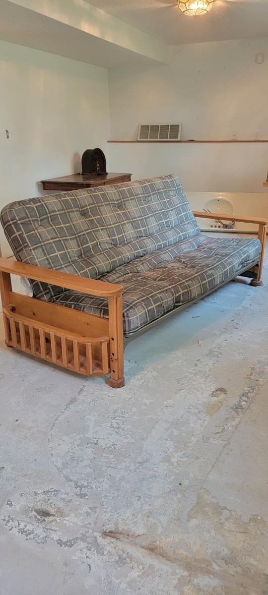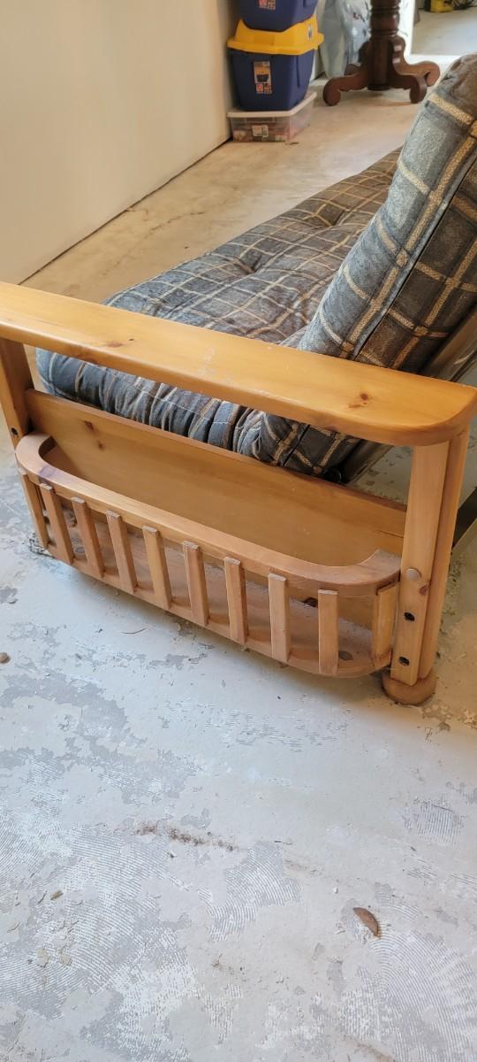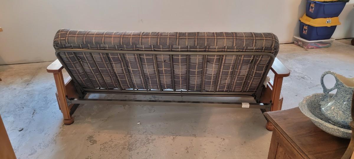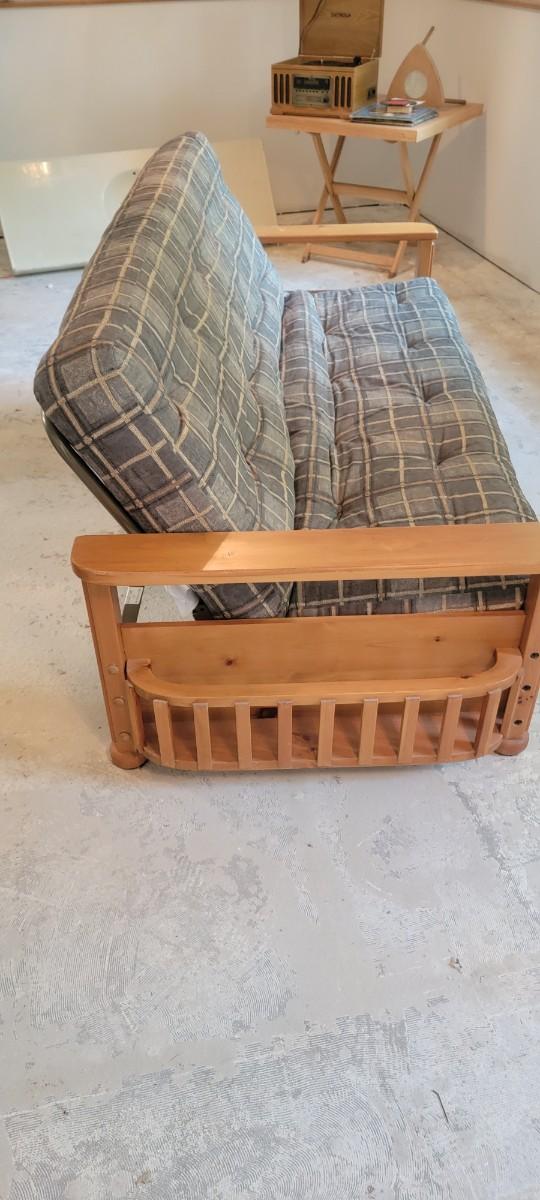 Futon wood with side magazine holders, green plaid. 89" wide wood mattress approximately 52" x 75"