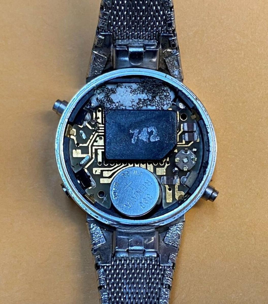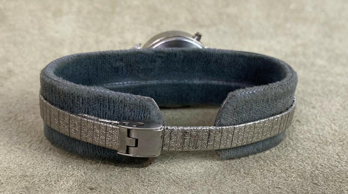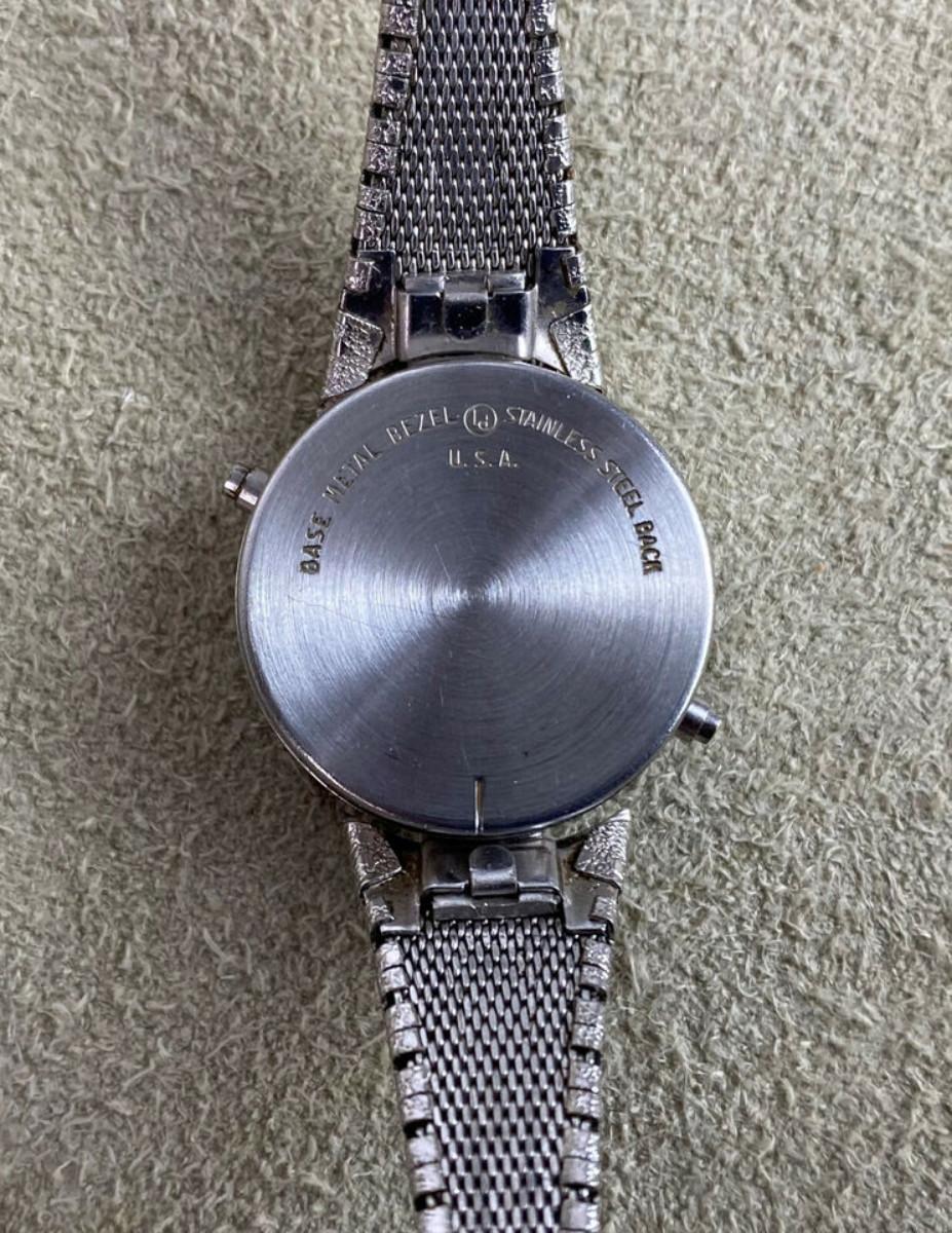a futuristic women's watch with three functions..Time..Day/Date..Stopwatch....LCD display...Blue face...We put a fresh battery in this vintage watch and it came to life...While the three time functions are working we didn't get any action on the dial light...Set easily...8" adjustable band...Surface scratches on crystal...As shown...Made in the USA by National Semiconductor we believe.