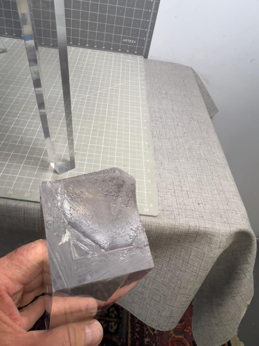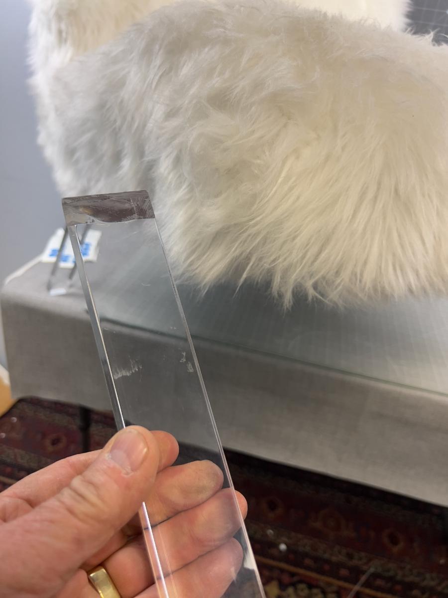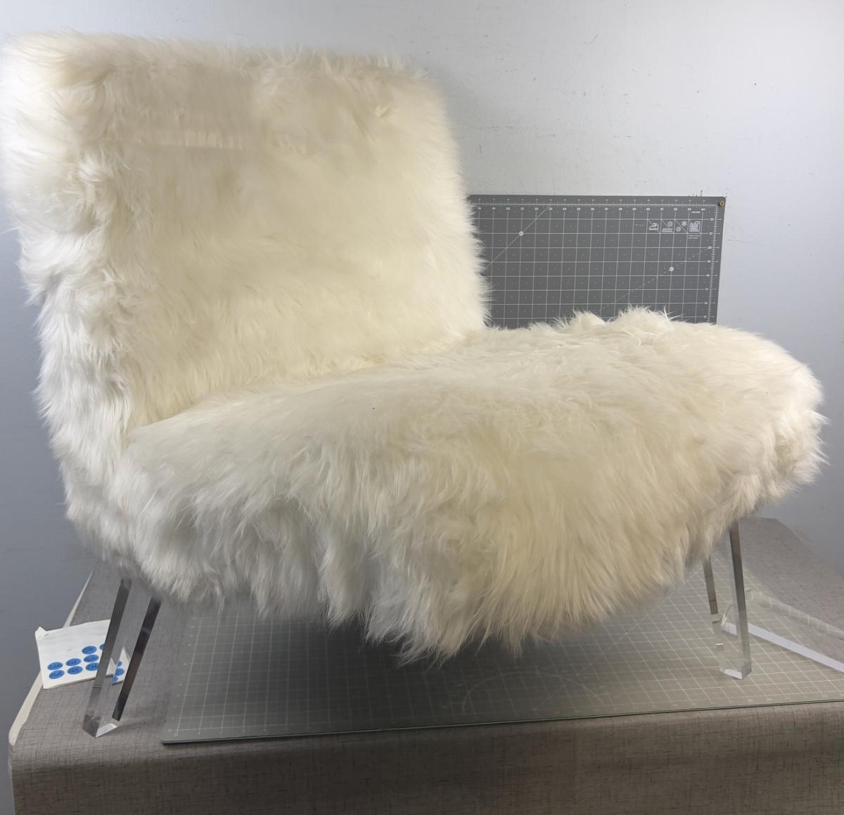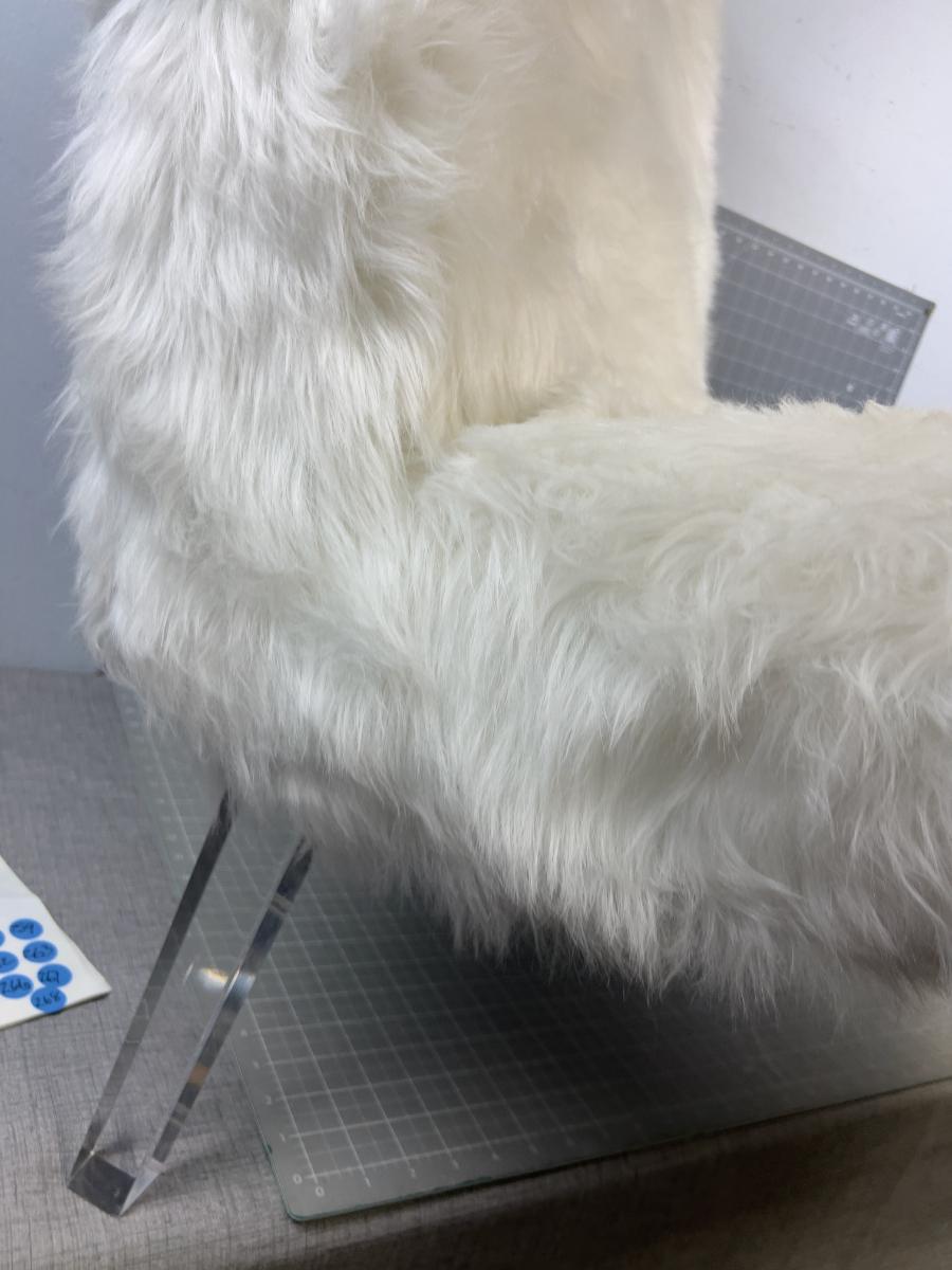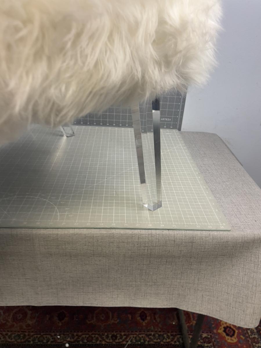 Acrylic or Lucite Fuzzy. Used. Good Condition other than the leg needing GLUED!!!!