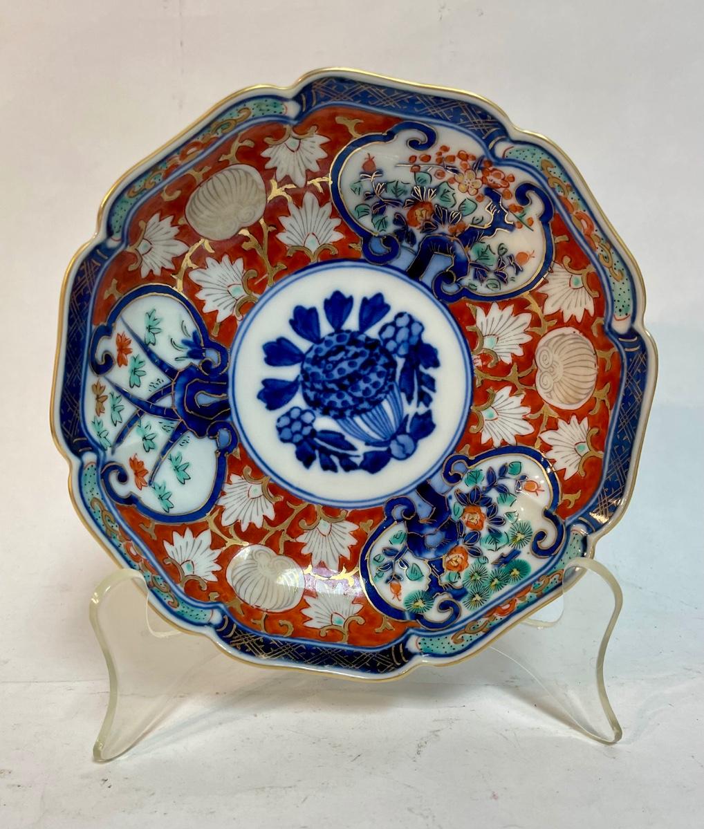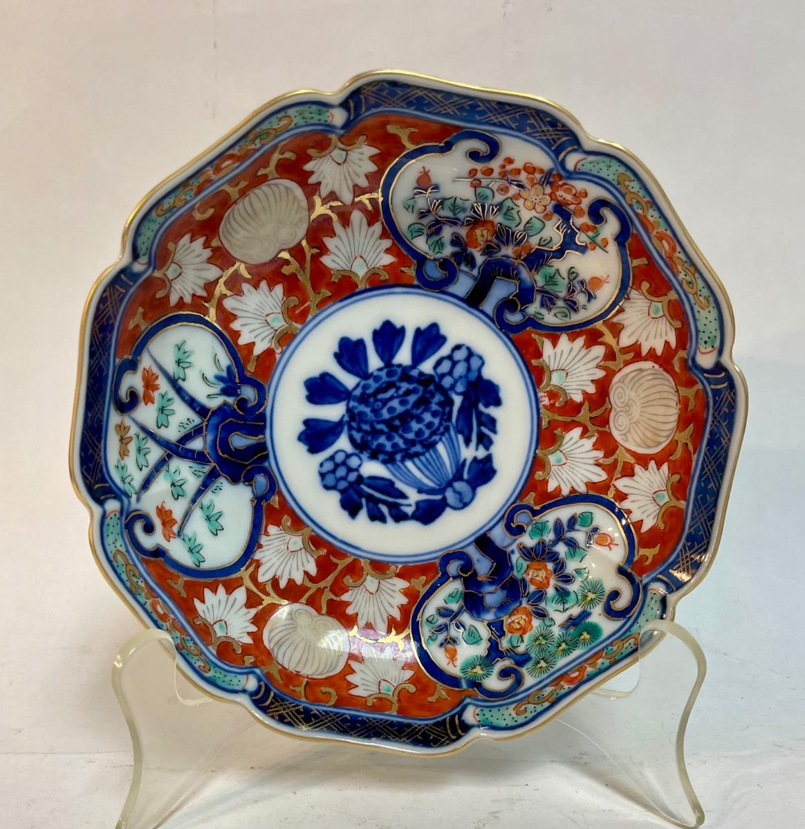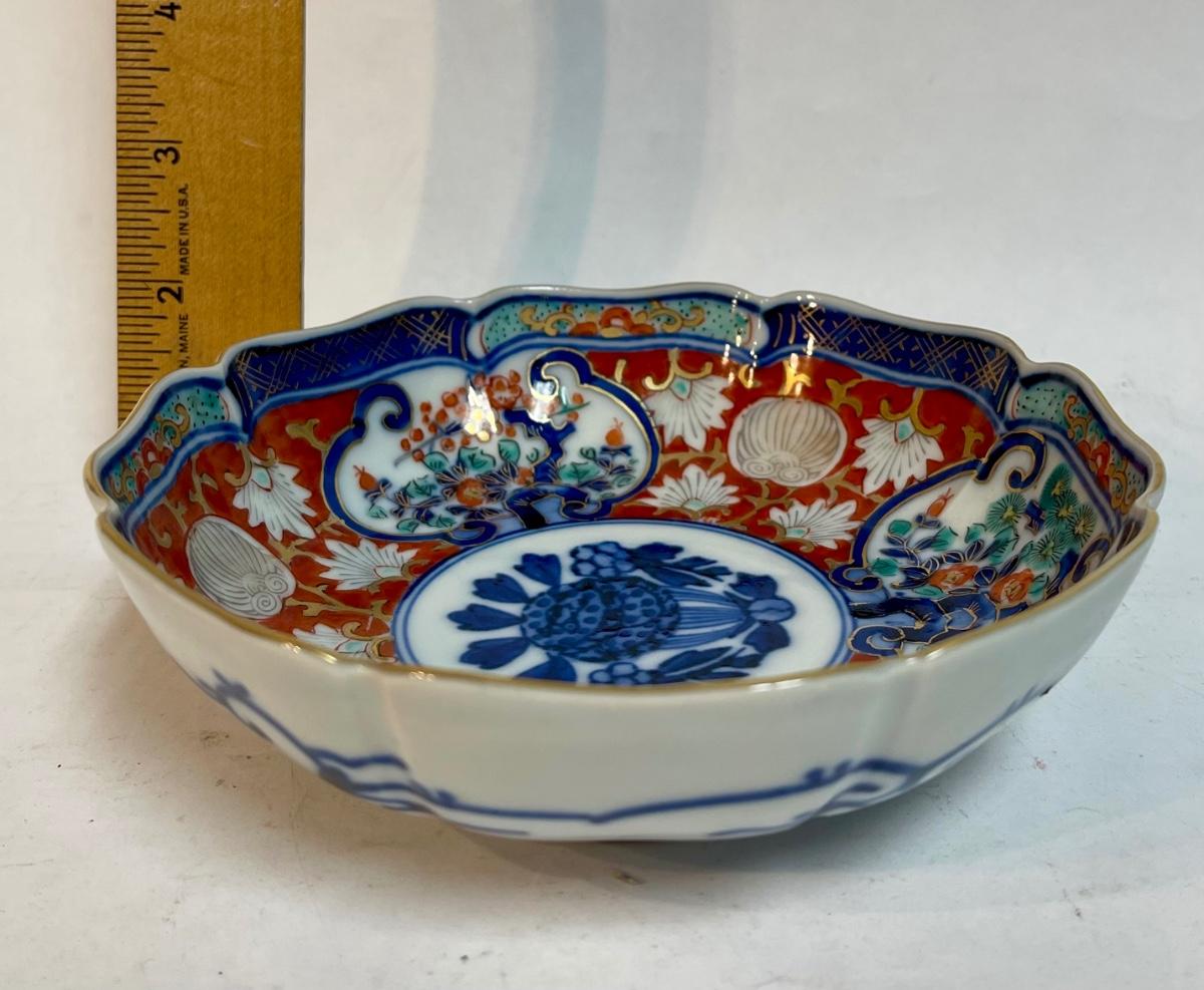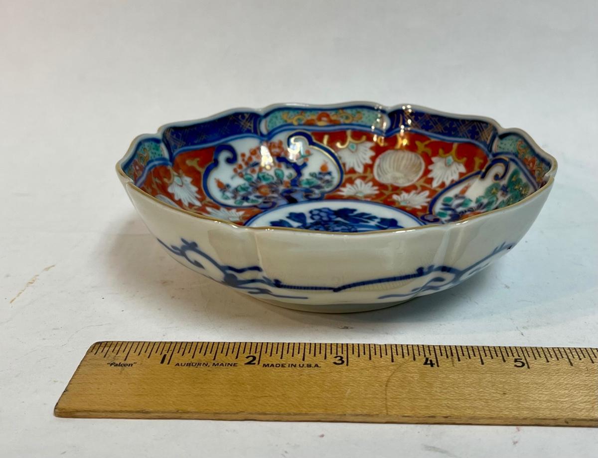 This is a vintage Asian porcelain bowl. It could be Chinese based on the markings on the bottom. The bowl is the traditional red white blue with gold trim. The edge has slights scallops. There are 3 medallions around the inner edge. And a center blue and white medallion. The rim diameter is 6 inches across. The bowl is 1.75 inches tall. It is in good condition with no chips or cracks.