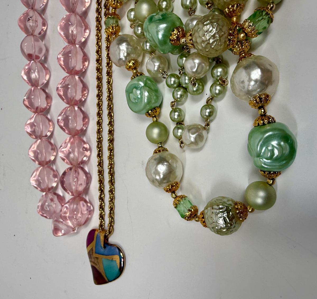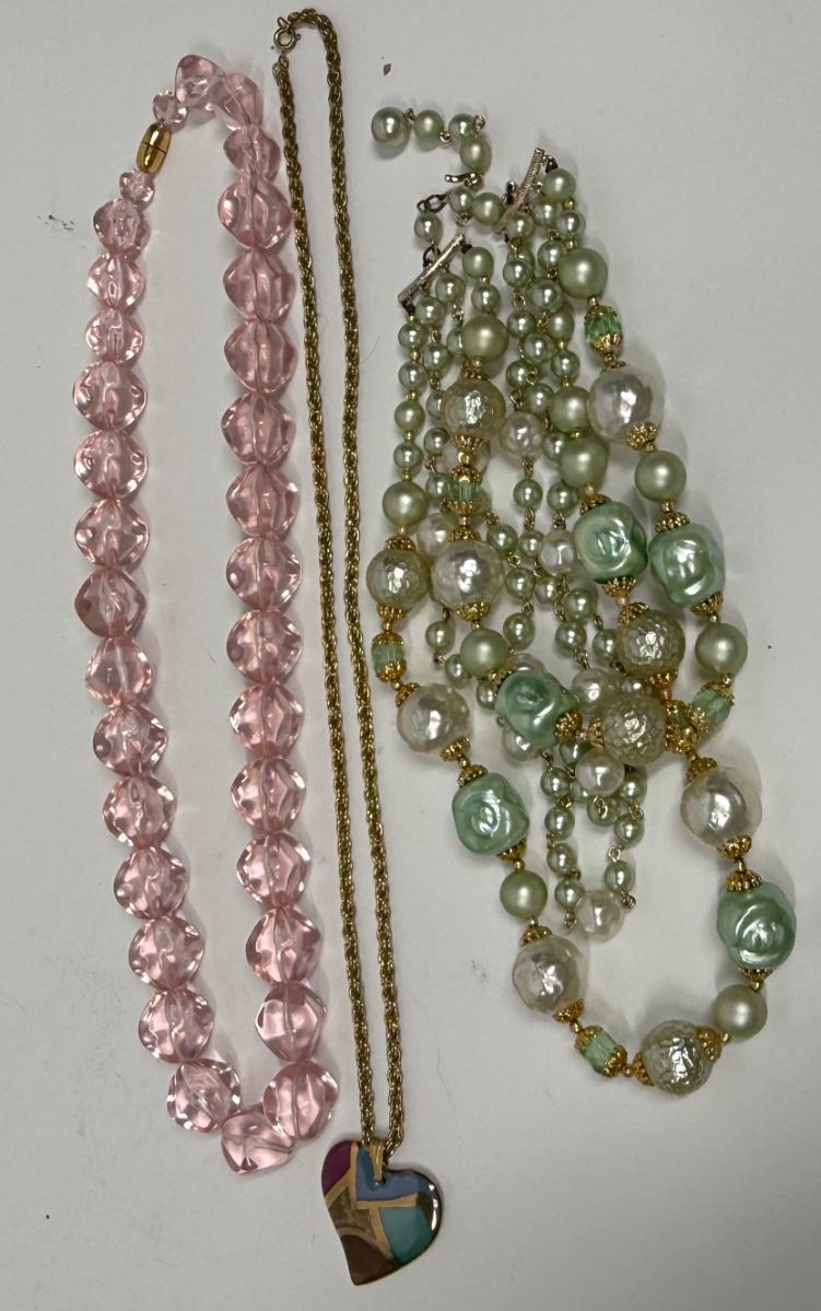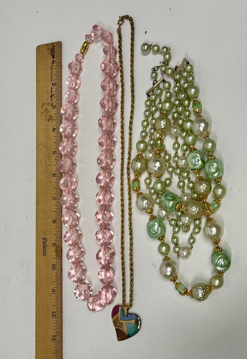 IN good condition - pink plastic Crystal Beads Single strand Necklace, Triple strand green beaded Necklace, Gold Chain Necklace with enameled heart Pendant.