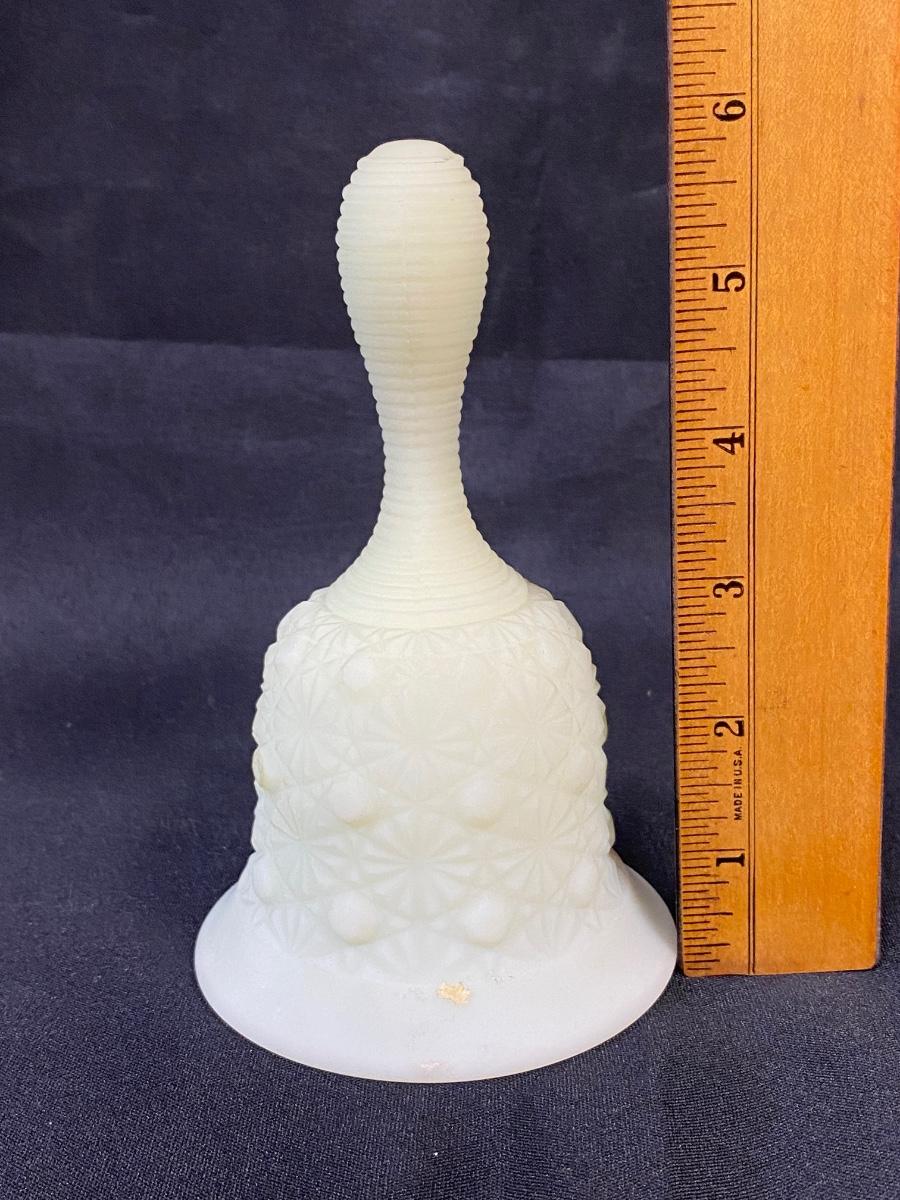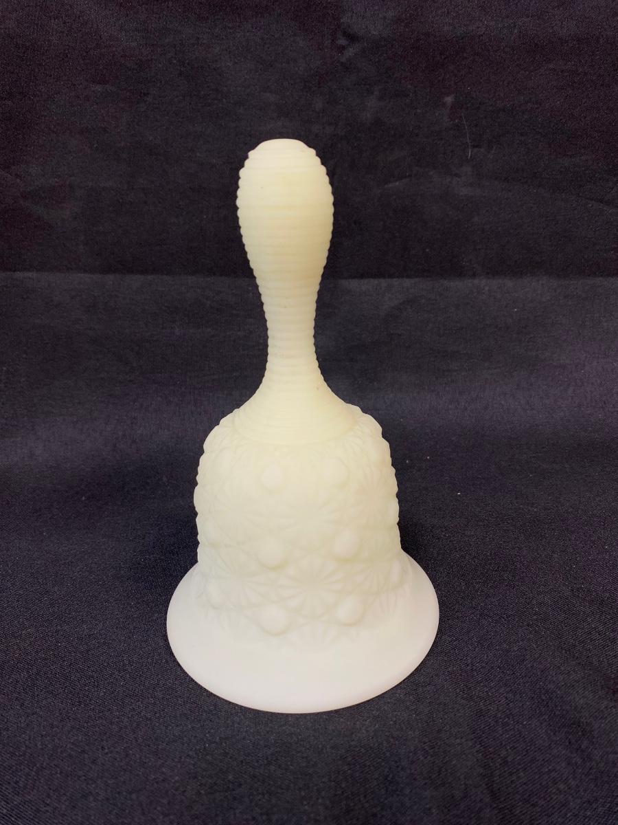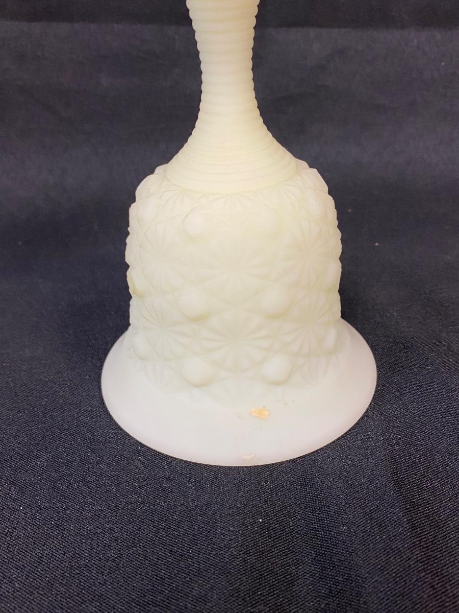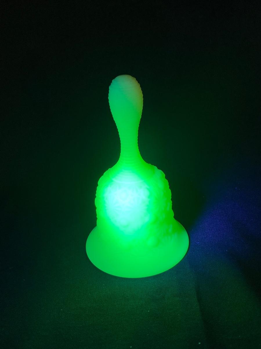 Vintage Pale Yellow Satin Fenton Daisy & Button Uranium Vaseline Glass Glowing Bell. High uranium content by how green it glows under black light. In good condition.