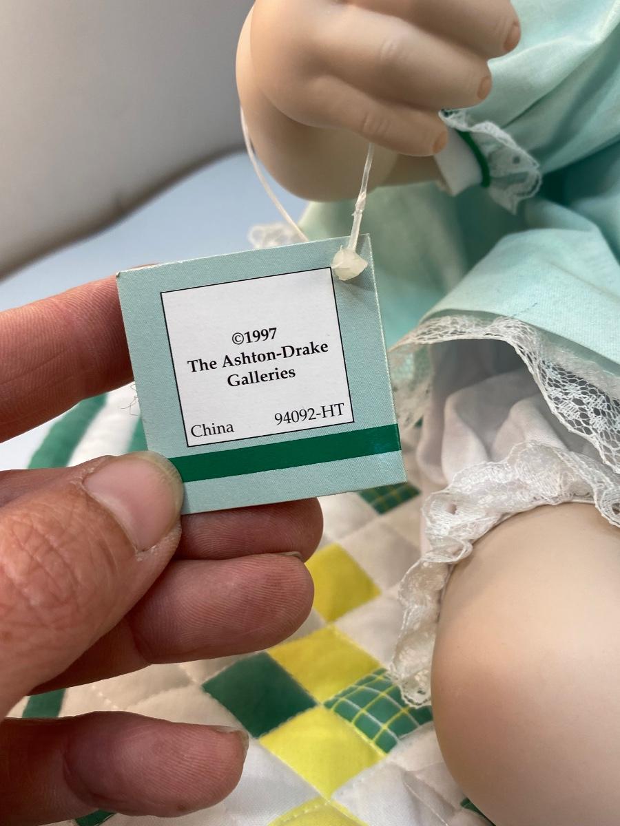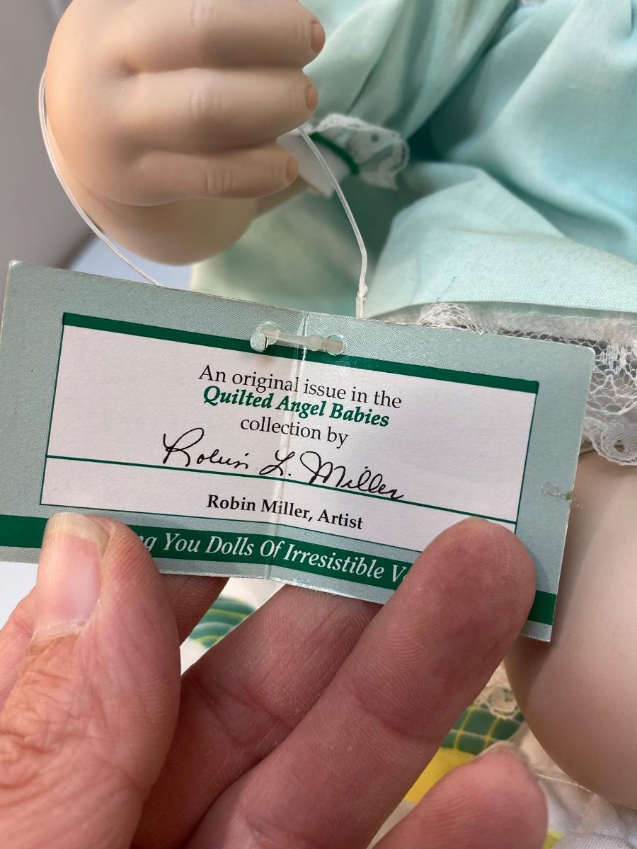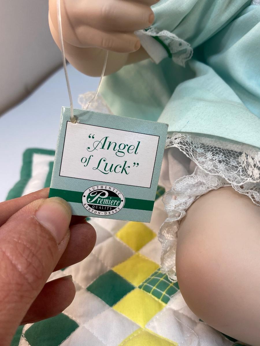 Robin Miller Quilted Angel Babies Porcelain Bisque Doll Angel of Luck Red Head with Green Eyes Ashton-Drake Galleries. In good condition. Has feathered angel wings that are removeable. Hang tag dates doll from 1997. Does have artist name and doll number on neck.