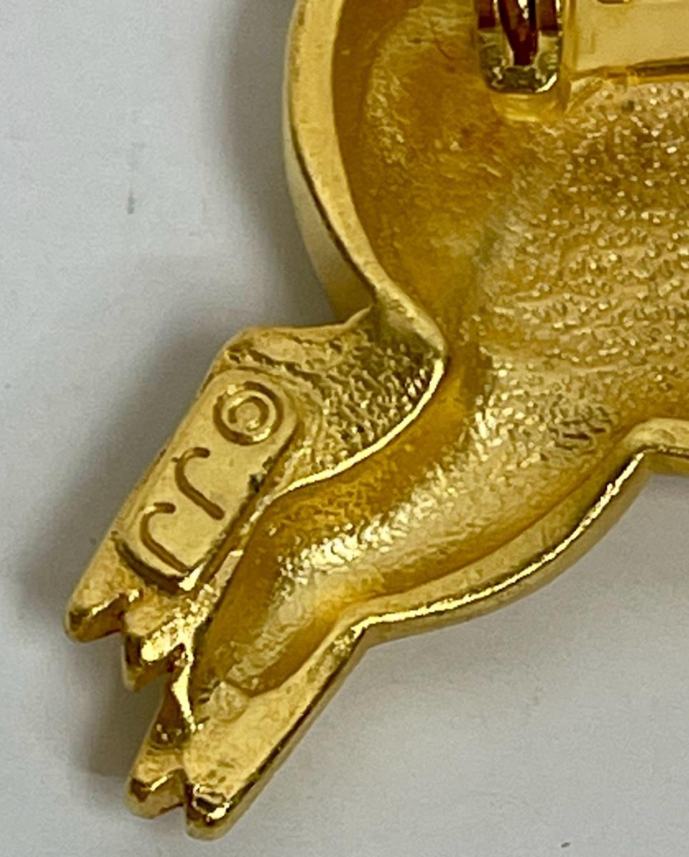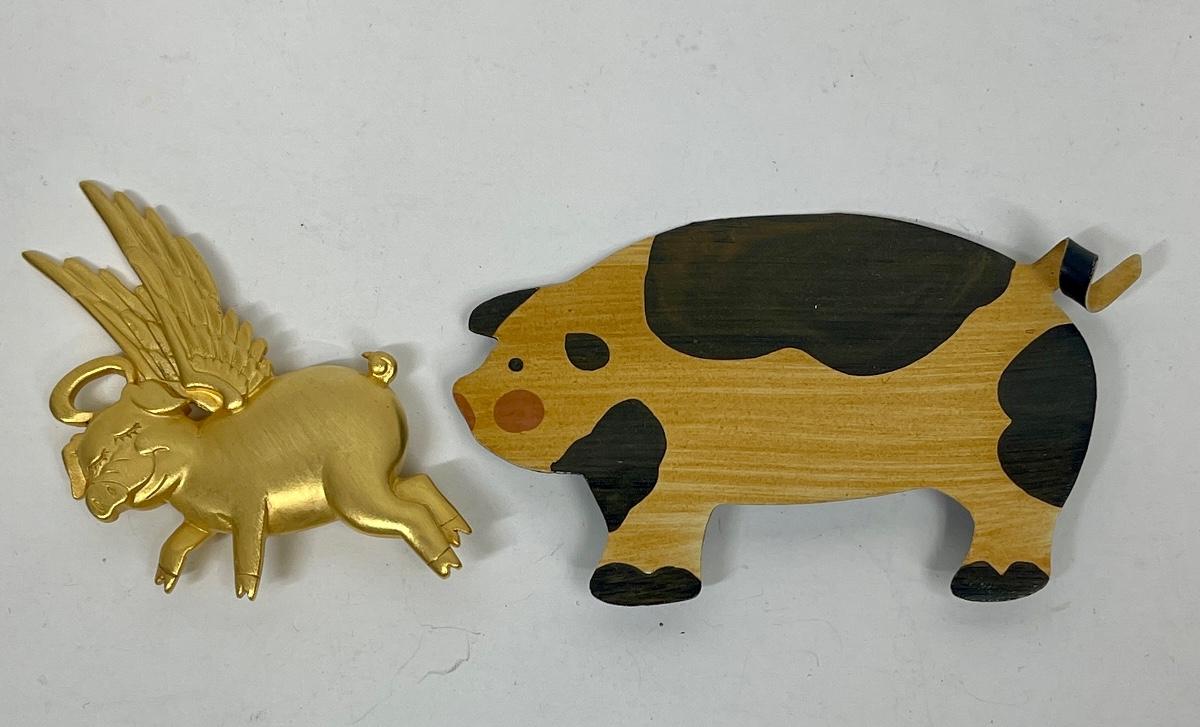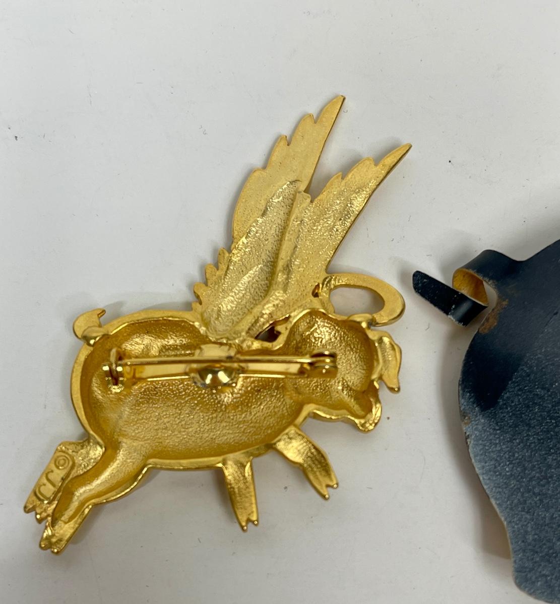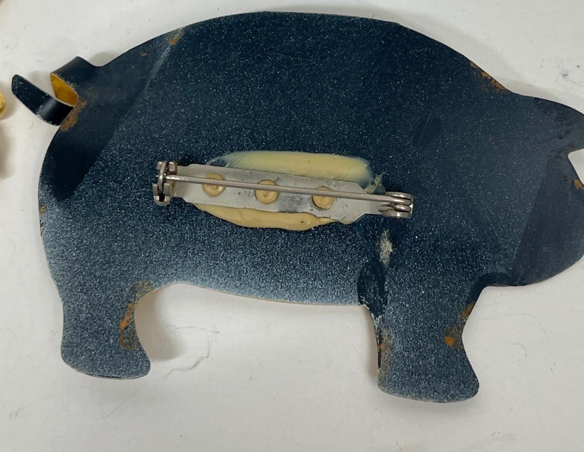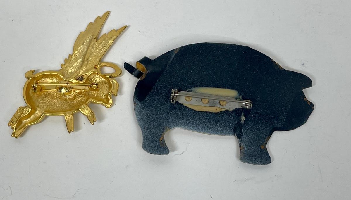2 Pig Pins or Brooches Gold Signed JJ brooch Black & Tan tin Pin