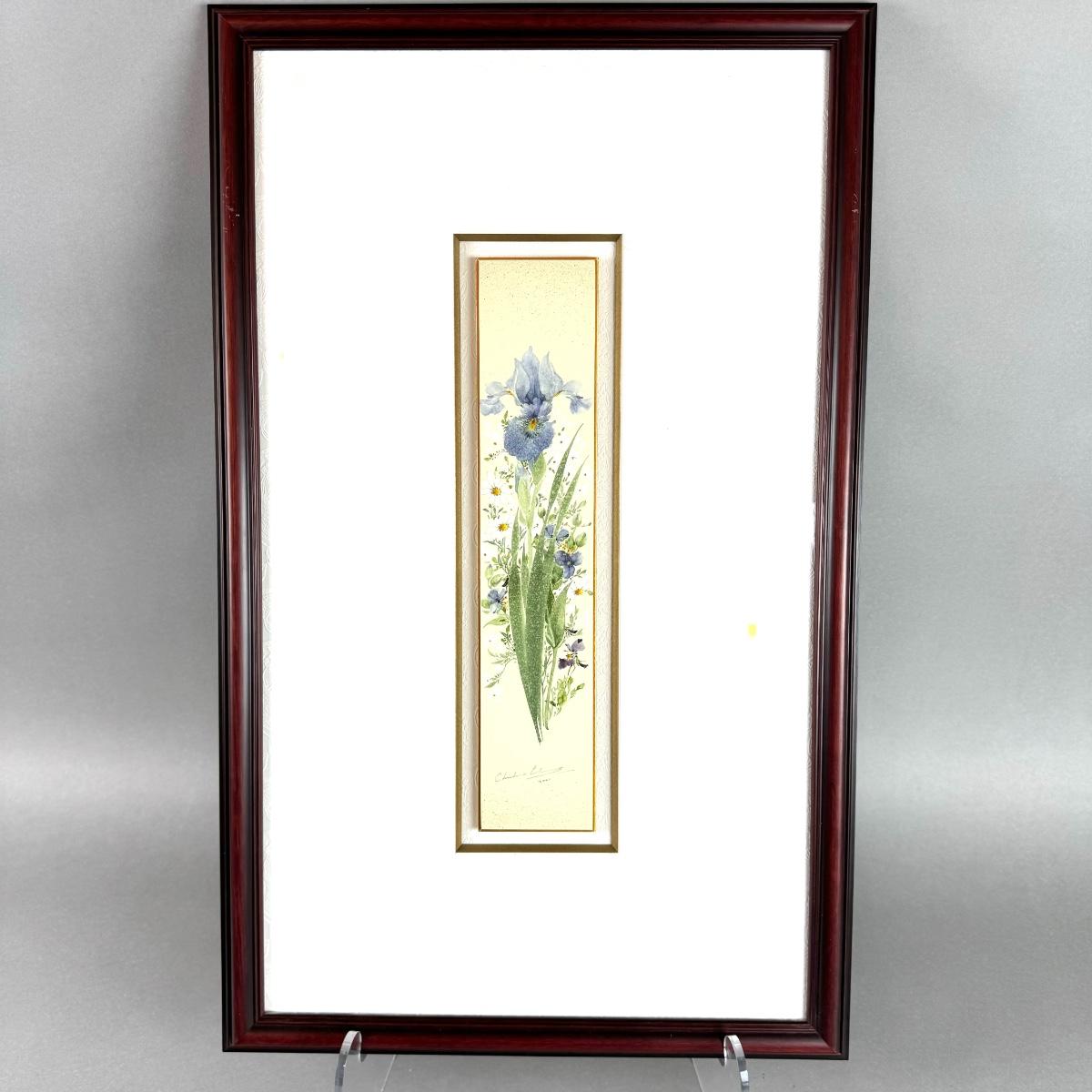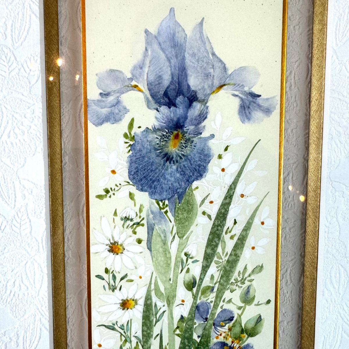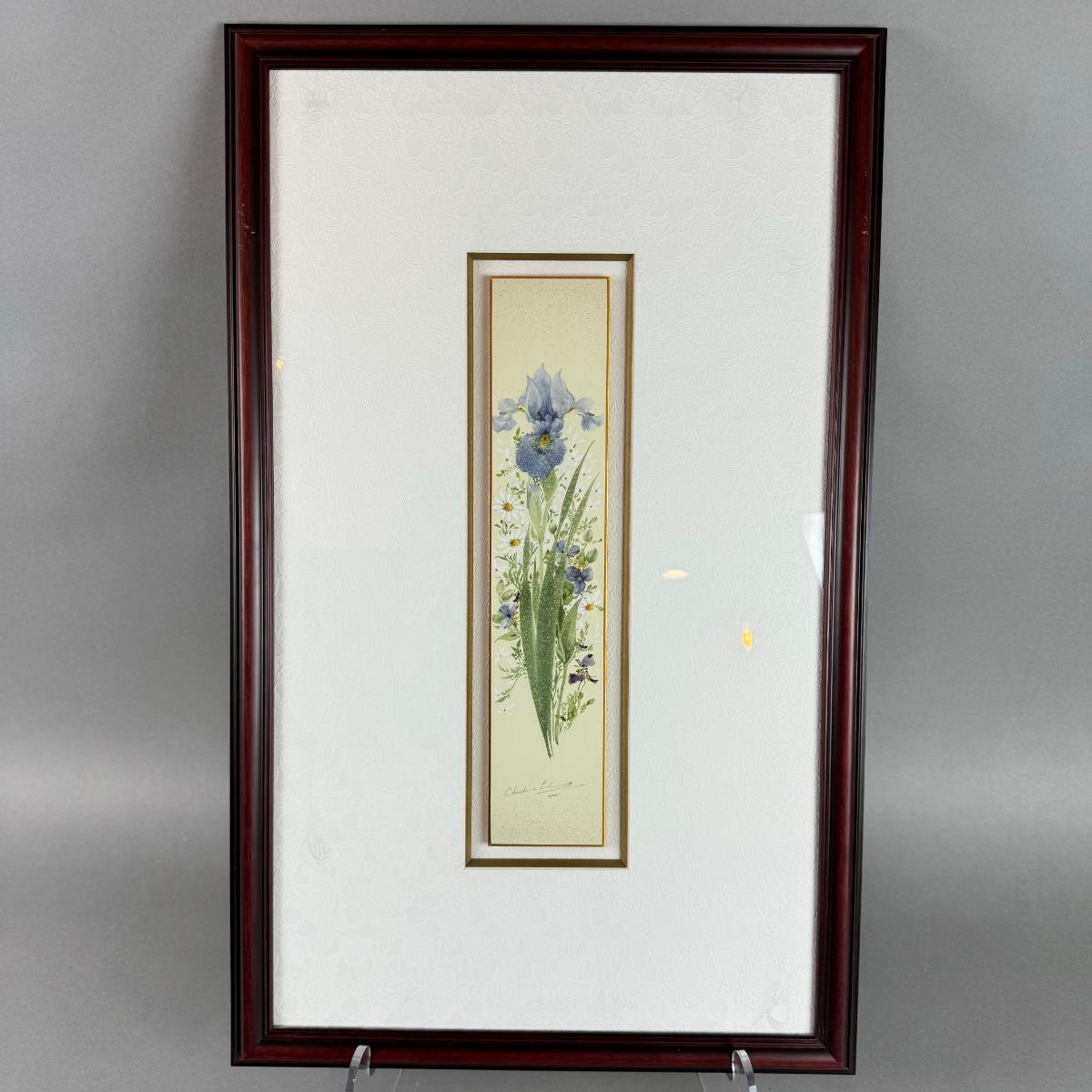 FY053 Original Iris Watercolor Framed with Damask Matting Signed in Lower Bottom