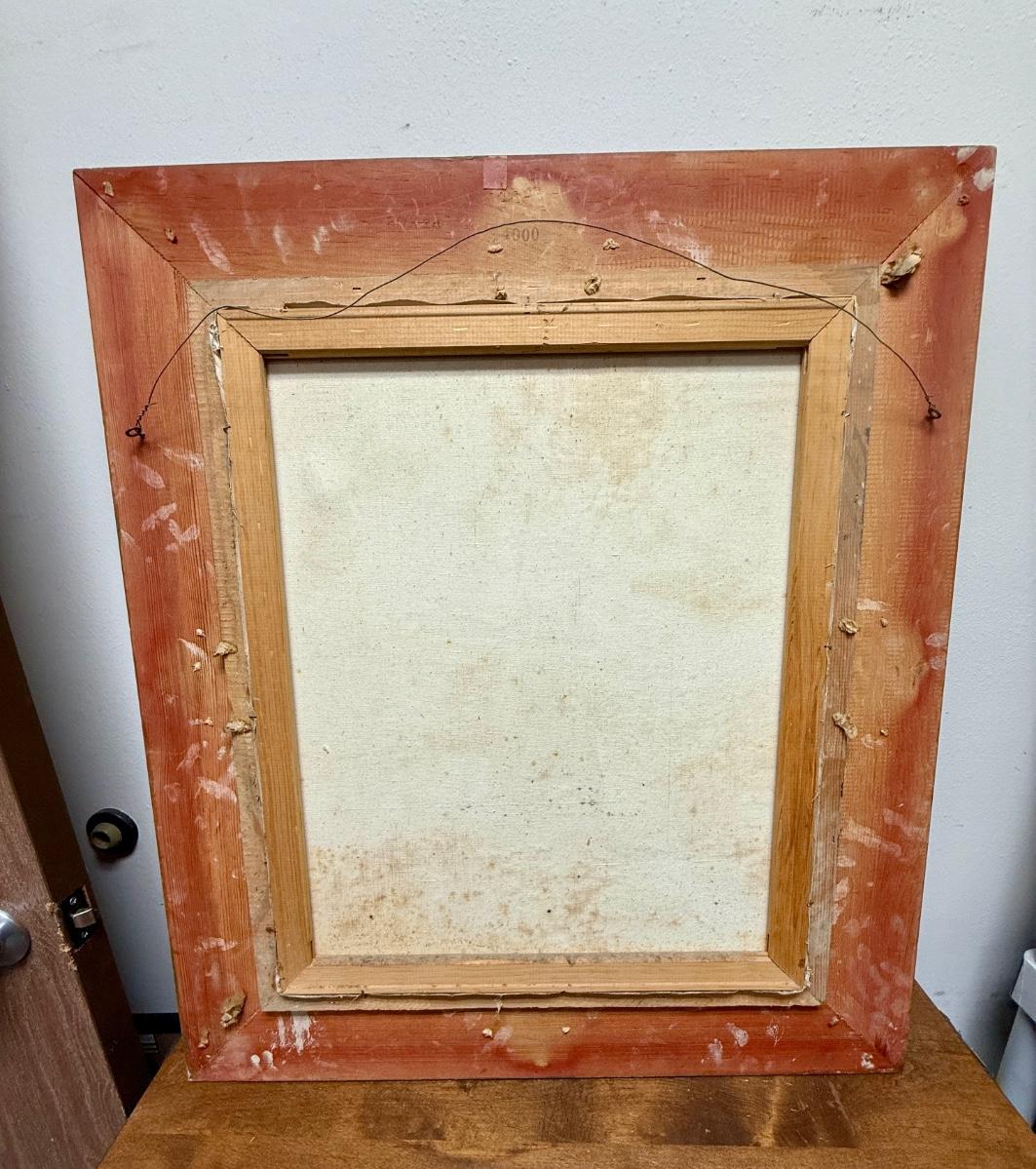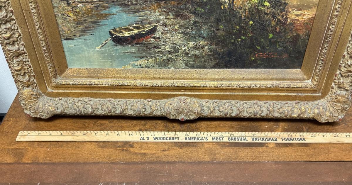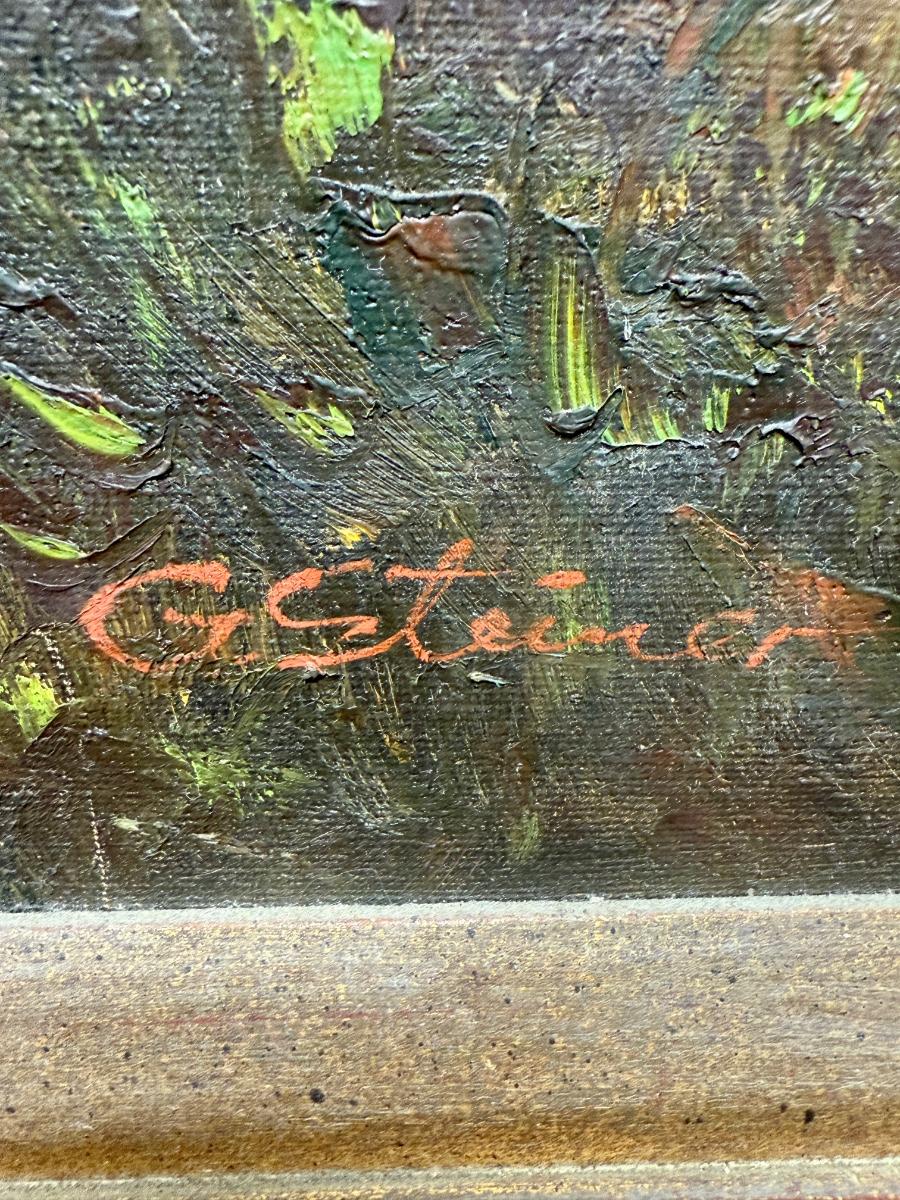 Approx. 33” x 29”, good condition except for a small split in the paint to the left of the windmill (canvas is OK). Artist is G. Steiner, looks to be inspired by a work titled “In the Month Of July” by Herbe.