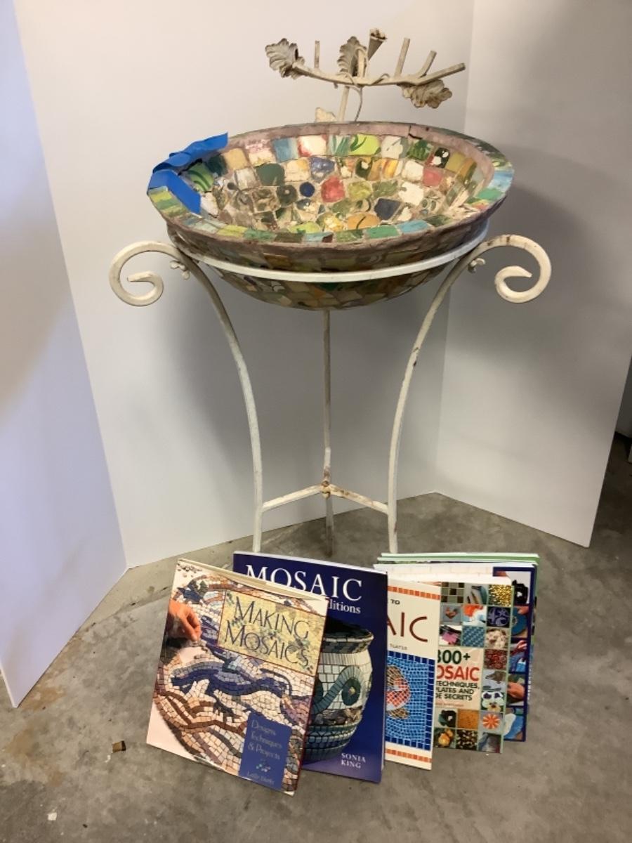 Mosaic Bird Bath on Wrought Iron Stand