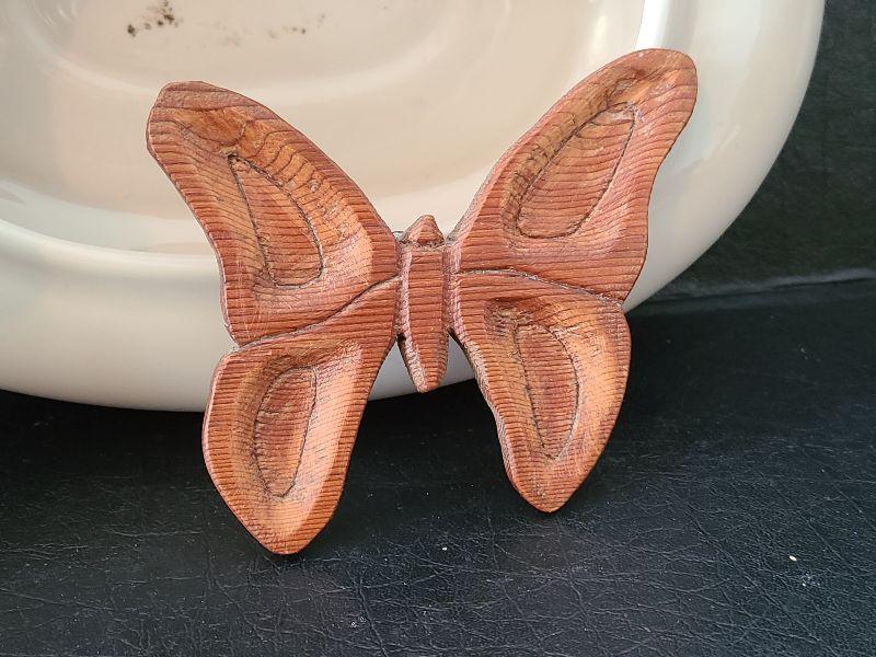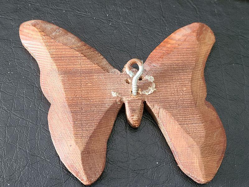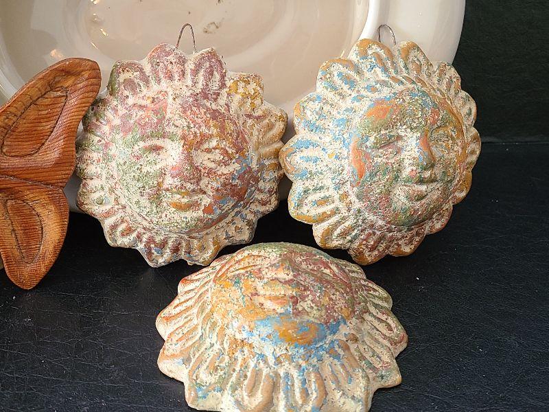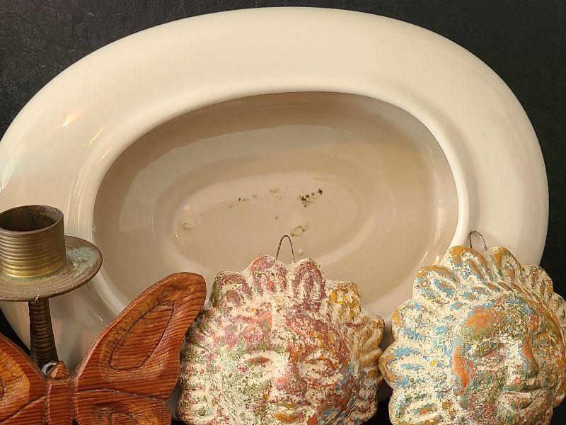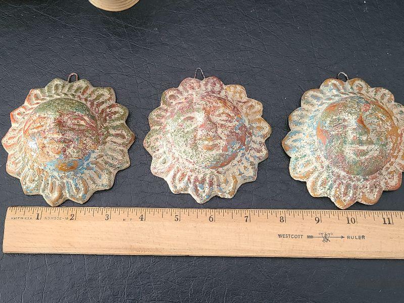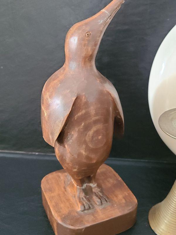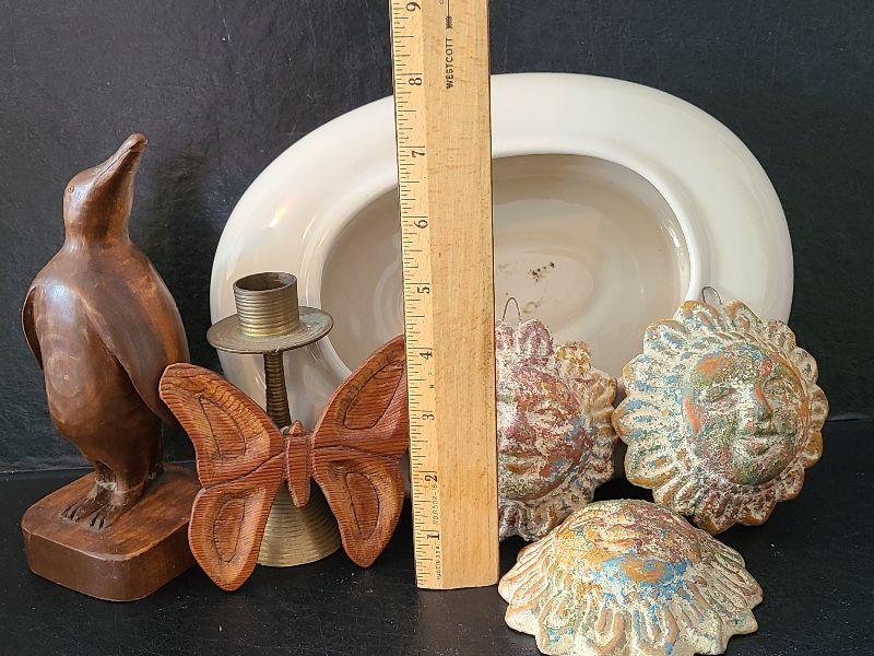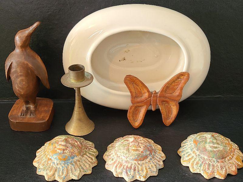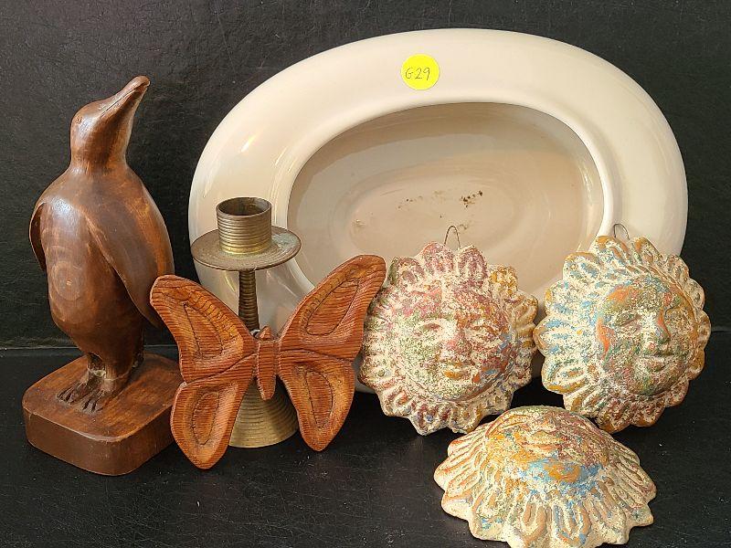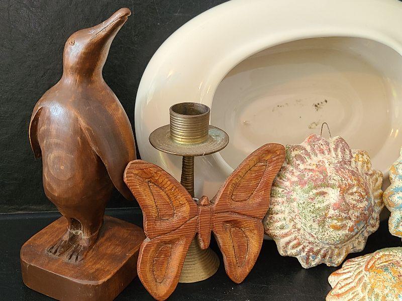Sun faces, wooden butterfly, penguin carved from wood, wing and beak have damage, brass candle stick, and a ceramic planter.