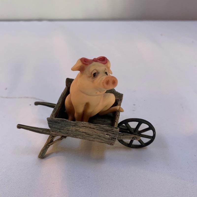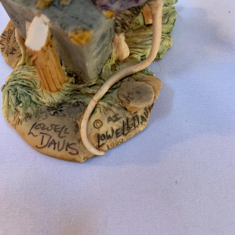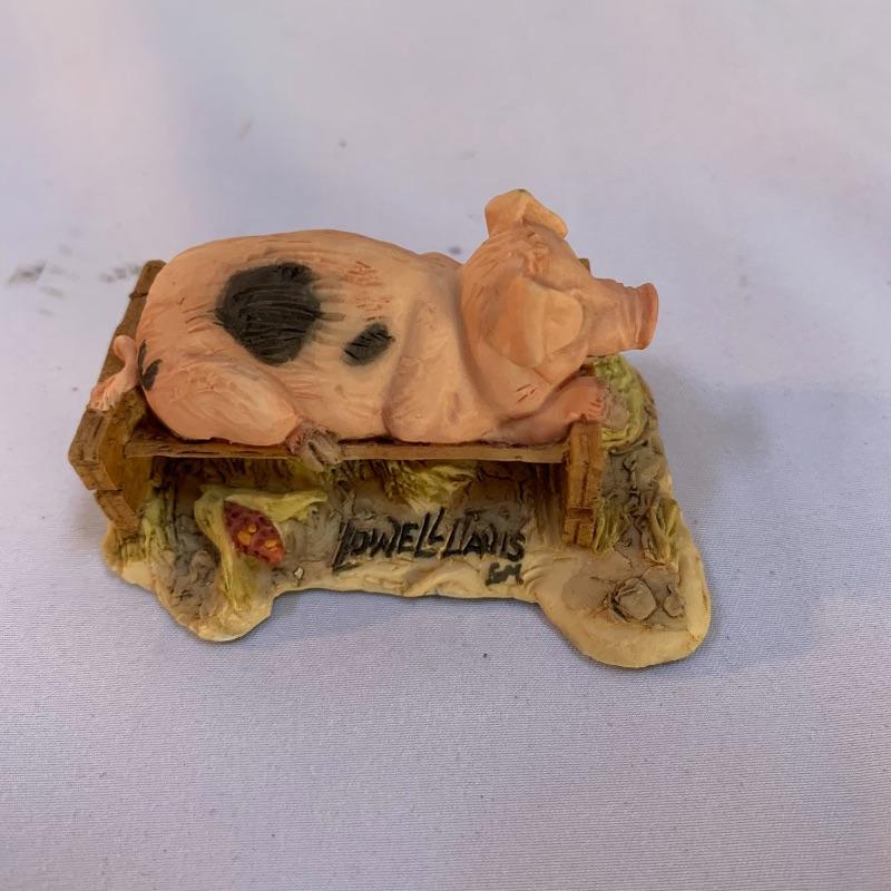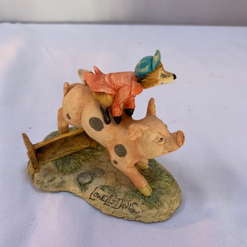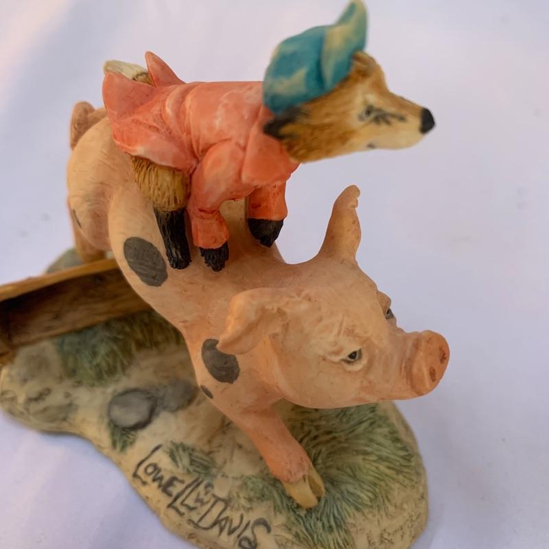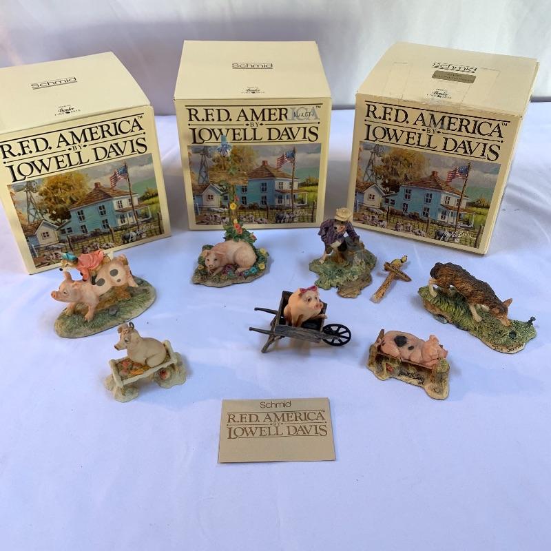 This lot contains multiple small figurines from the R.F.D. America set by Lowell Davis. They depict pigs doing miscellaneous activities and wolves both acting natural and wearing cute outfits. A stick on one of the wolf figurines has broken off. Shipping available.