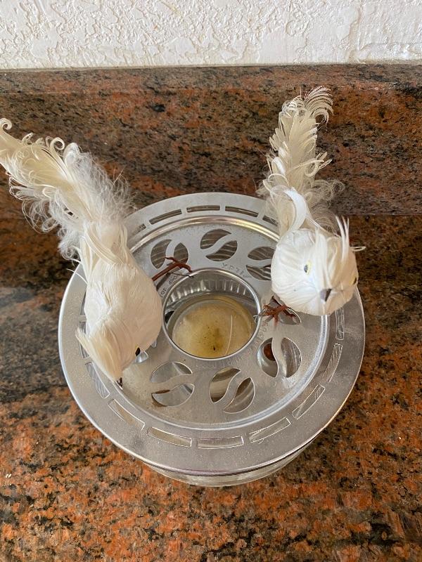 Vintage Silex candle warmer base. Great for chaffing dishes or as a candleholder. Previous owner used it for decor. Good condition. Birds can be removed.
