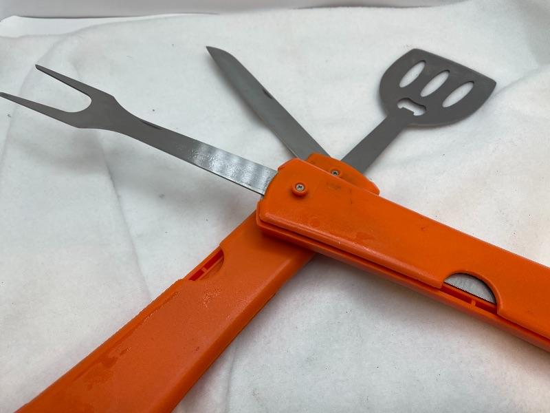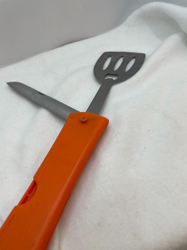 A stainless steel spatula fork knife flip out from an easy-grip handle