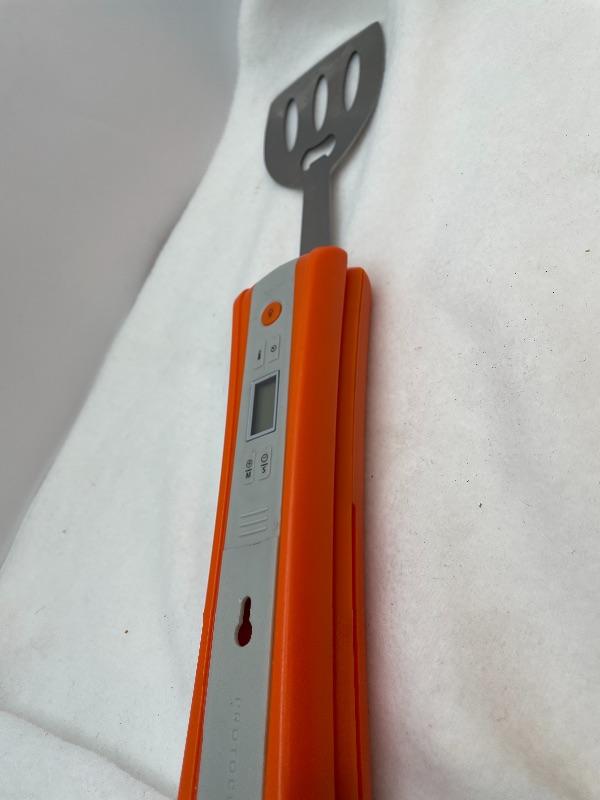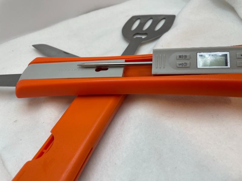 Grilling multi-tool includes knife, spatula, fork, bottle opener, flashlight, meat thermometer, timer with alarm.