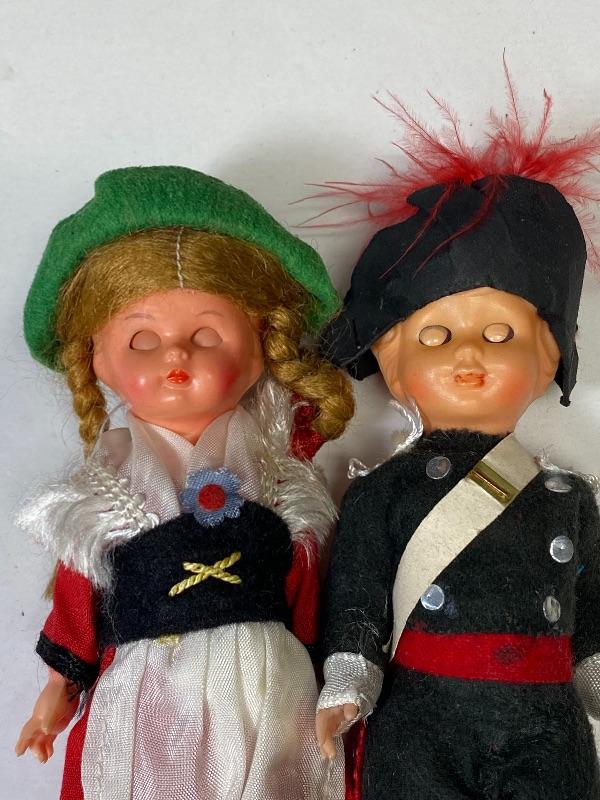 Pair of sleep eye celluloid dolls. Wearing European style outfits maybe Bavarian or Dutch. Moveable arms. About 5.5" tall. The boy doll is missing shoes, his feet are painted black like boots but he has toes visible. Good condition, unmarked.