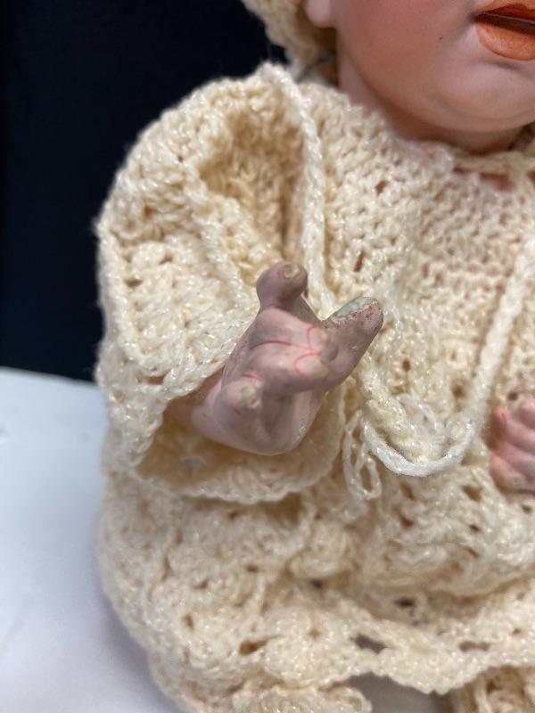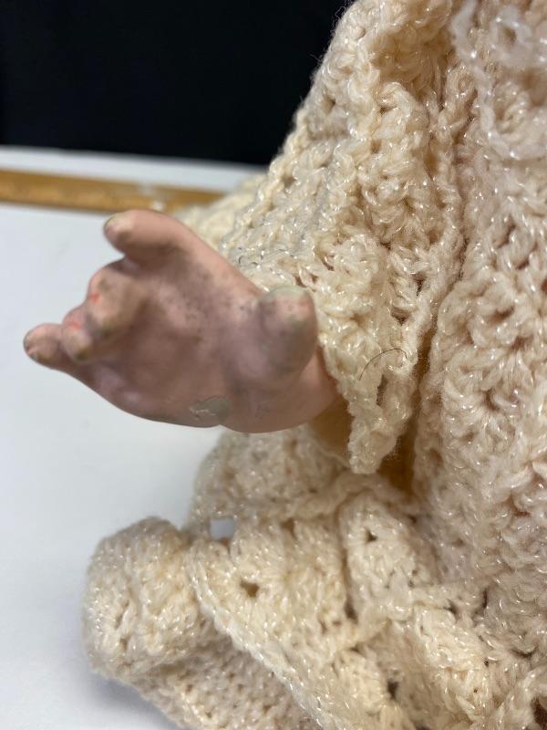 12" antique baby doll. Composite jointed body with porcelain head. Only mark on head is #10. Painted features. Light cracking to composite. Wearing matching crochet outfit.