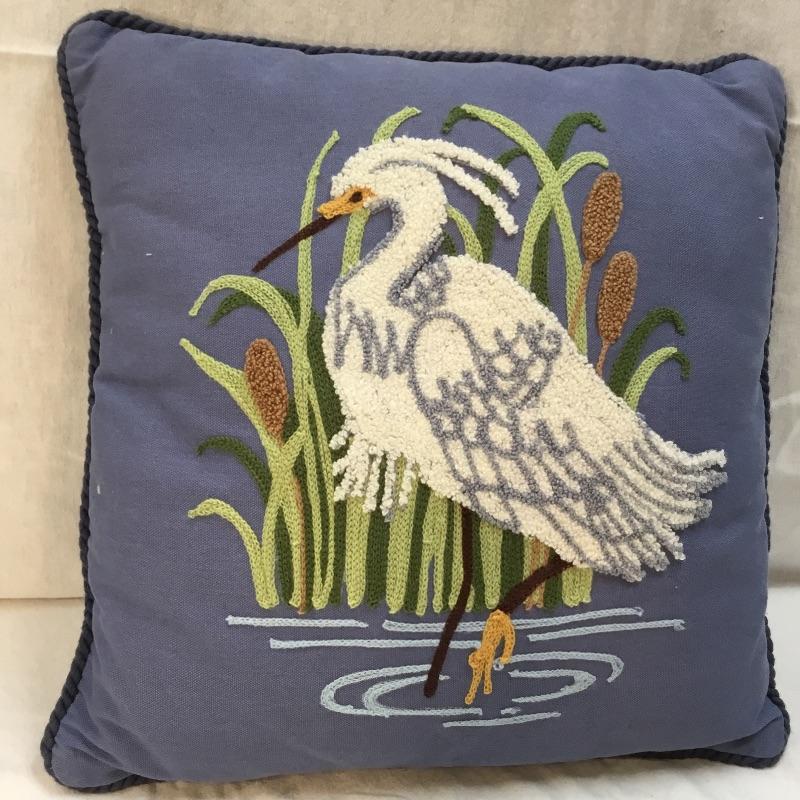 Decorative heron throw pillow. Nicely textured needlepoint design. About 14" size.