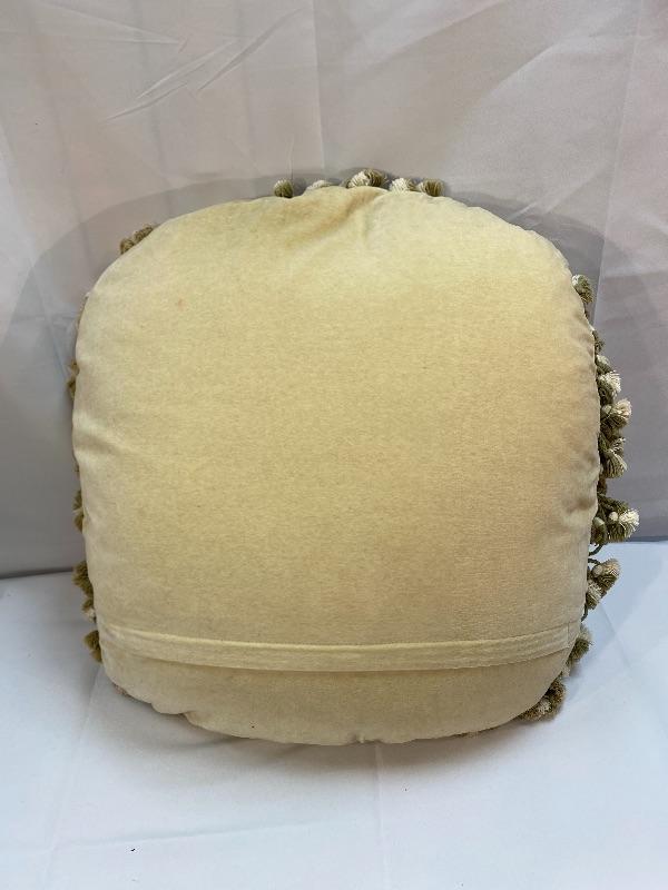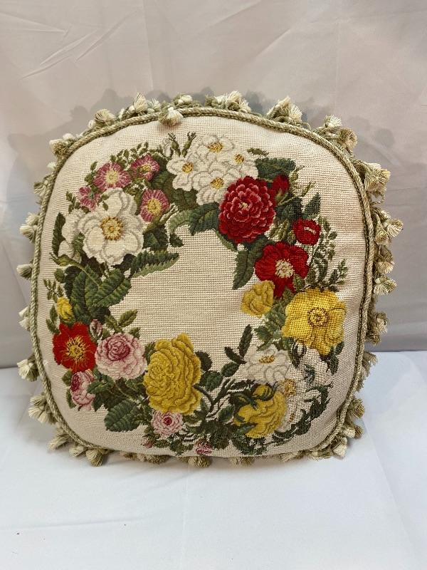 Large floral needlepoint pillow. Tassel edge. About 17" in size.
