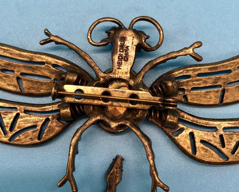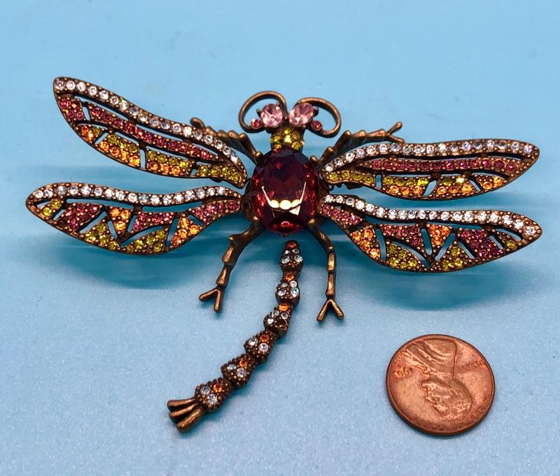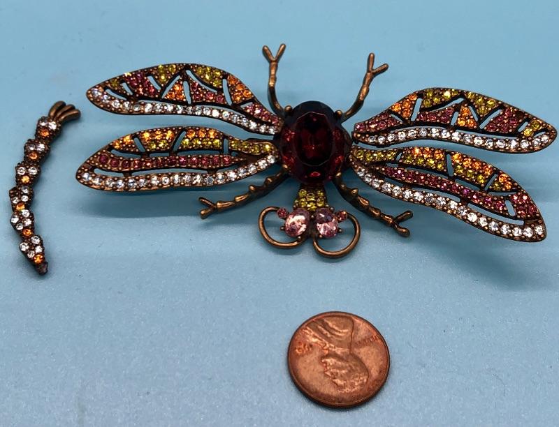 Beautiful Heidi Daus rhinestone dragonfly pin. Needs tail reattached or wear as is, looks like a beetle. Penny added for size.
