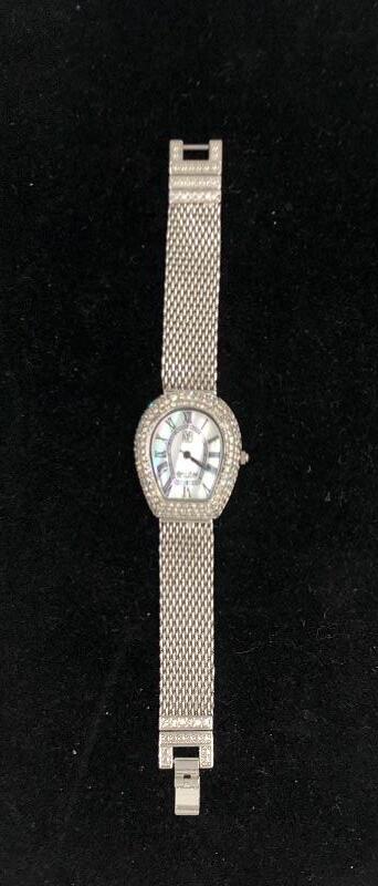 Woman's silver tone Victoria Weick watch. Mother of pearl and rhinestone face. Has a horseshoe shape to it. Mesh silver tone band. About 6.5" length. No missing stones. Currently not running.