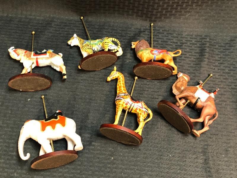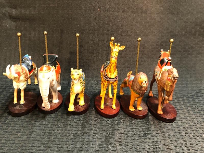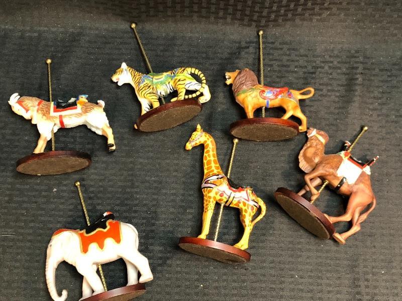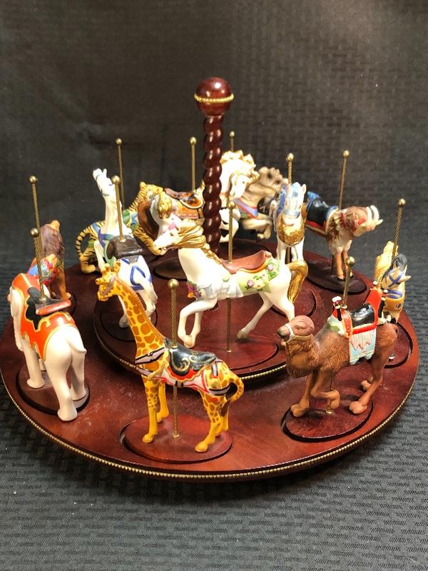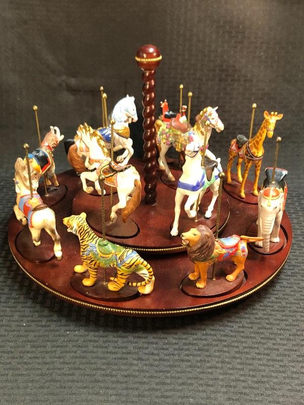 Wonderful Franklin Mint collectors carousel. Wood base holds 12 carousel animal figurines. More then horses, there is a lion, tiger, elephant, giraffe, camel, and a goat. Excellent condition.