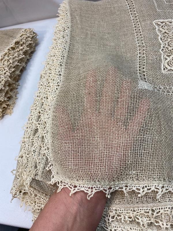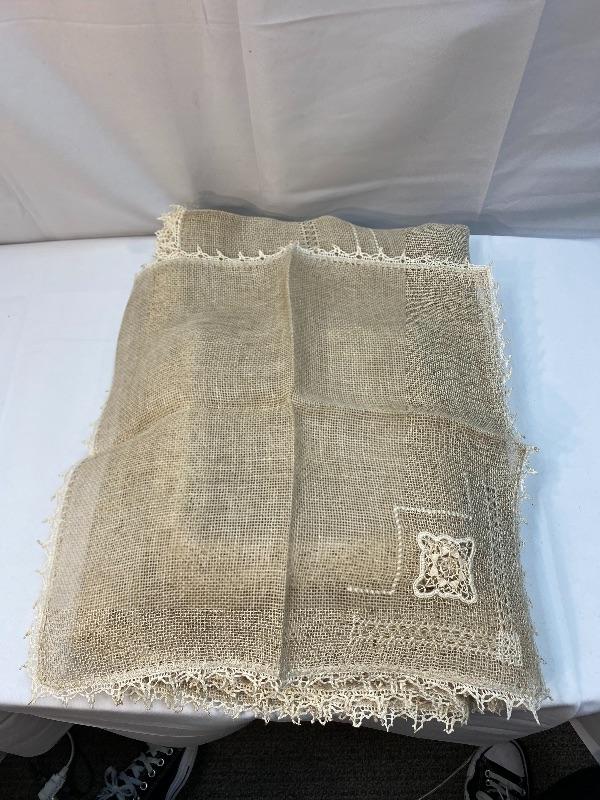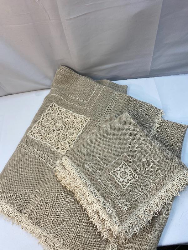 Rustic Burlap Tablecloth and 12 napkins vintage linen, light brown with cream lace trim