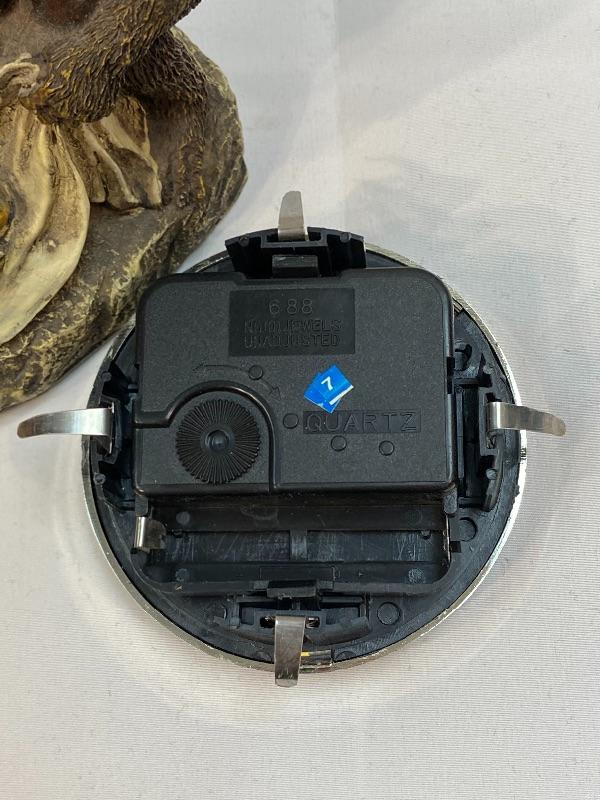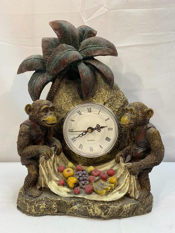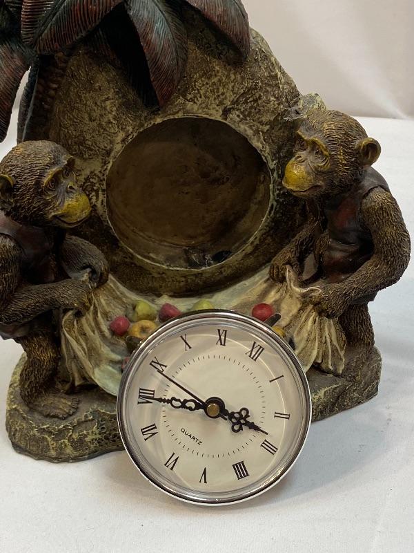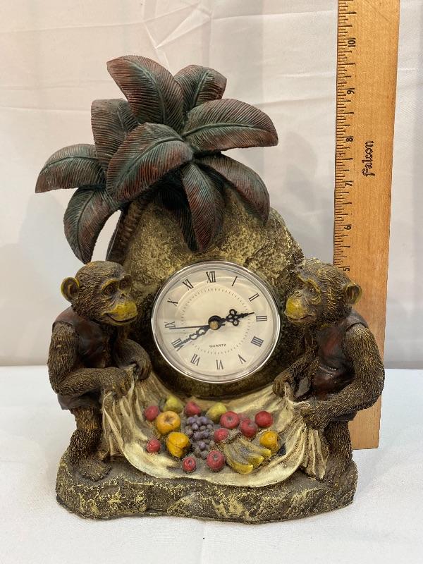 Eclectic monkey table clock. Unbranded. Battery operated, clock piece pulls out to change battery. Currently not running. Good condition.