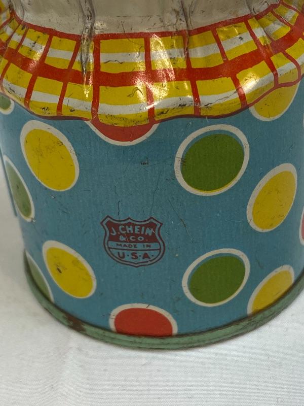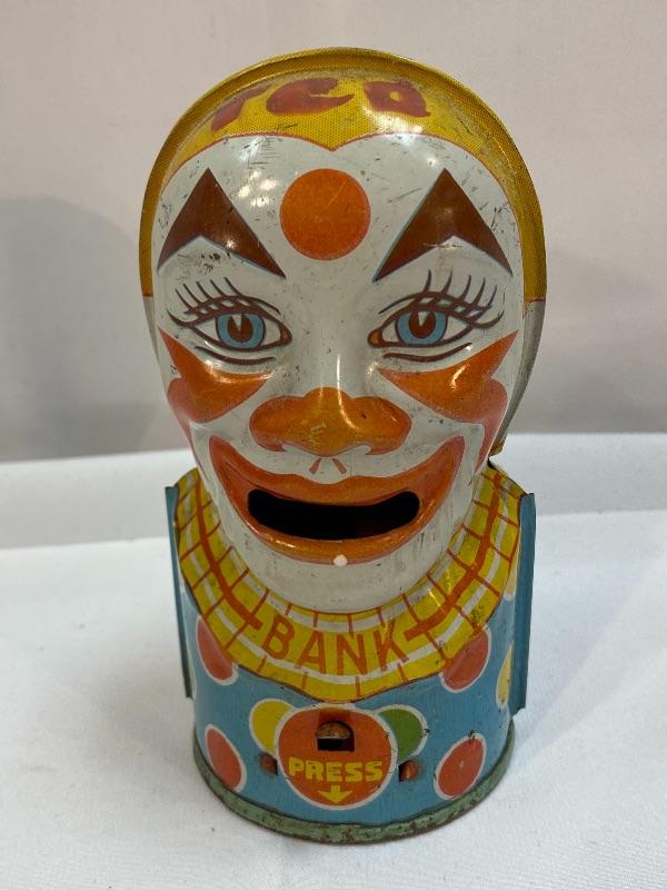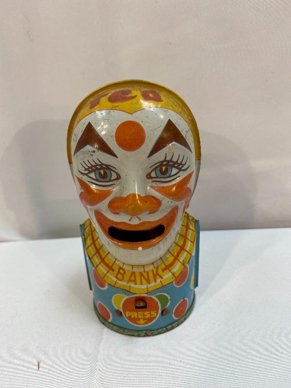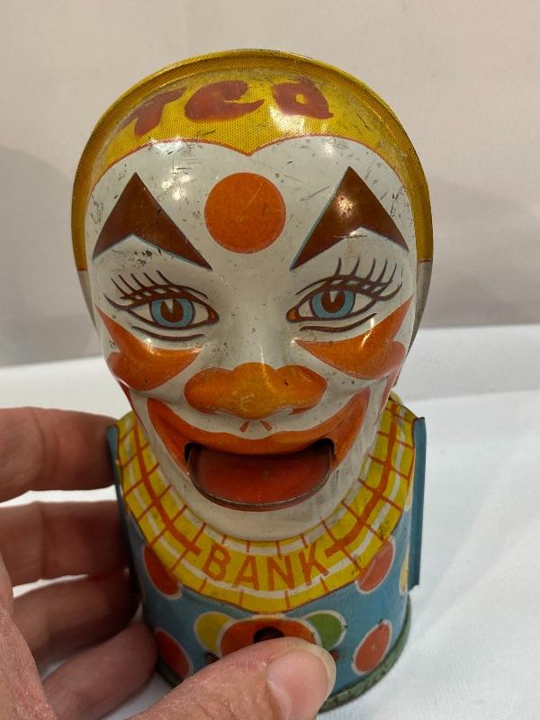 Vintage J Chein & Co mechanical Clown bank. Press the lever and he sticks his tongue out to put coin on. Fair condition, does have scratches and Ted wrote his name on the top. Displays great, works nicely. About 5" tall.