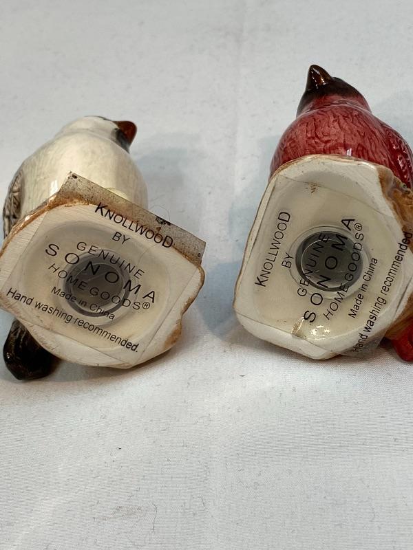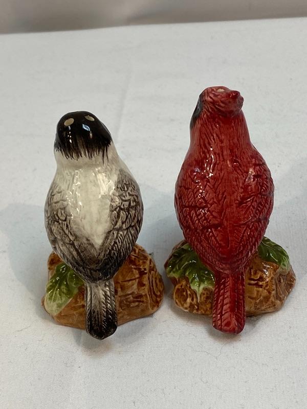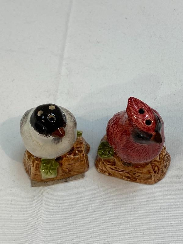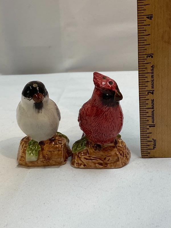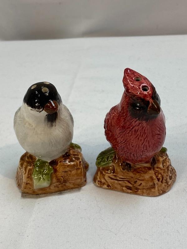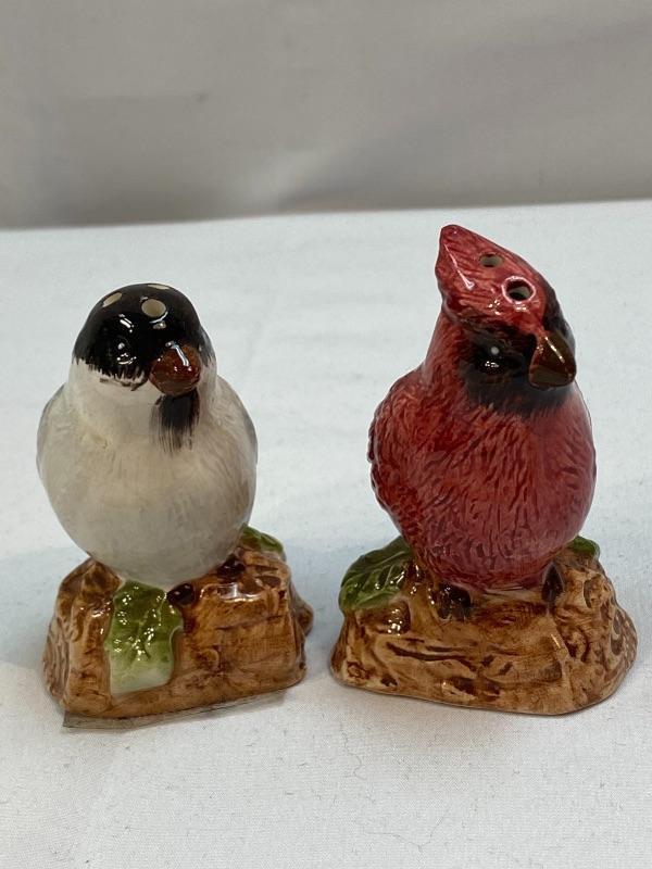 Pair of bird salt and pepper shakers. A sparrow and a cardinal. Have original stickers on the bottom. Small size, under 3".