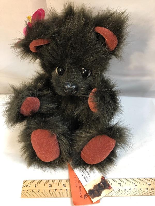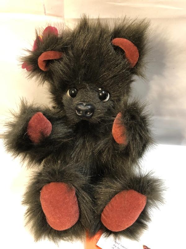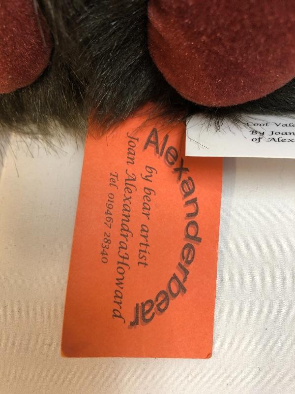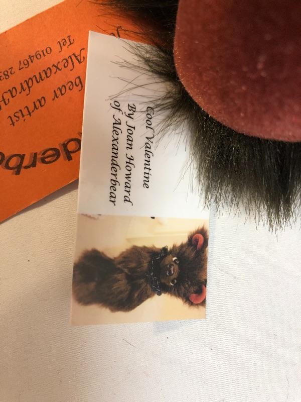 2013 Alexanderbear "My Cool Valentine" by artist Joan Howard. Dark fluffy bear with red accents. Jointed limbs.