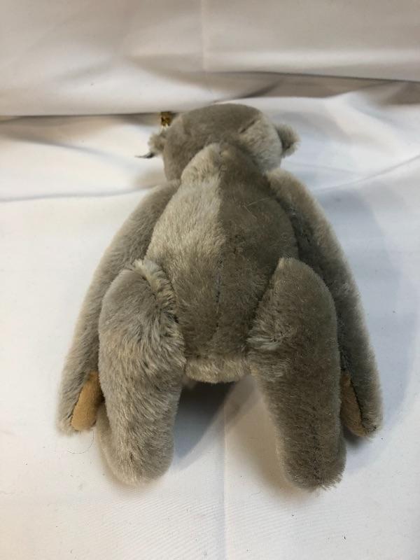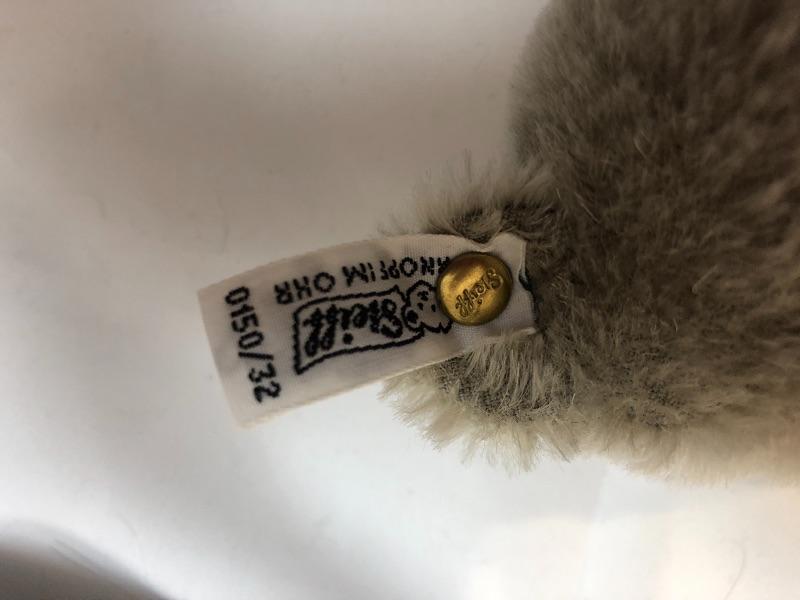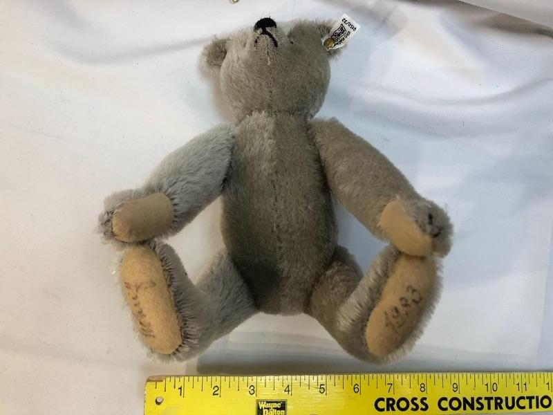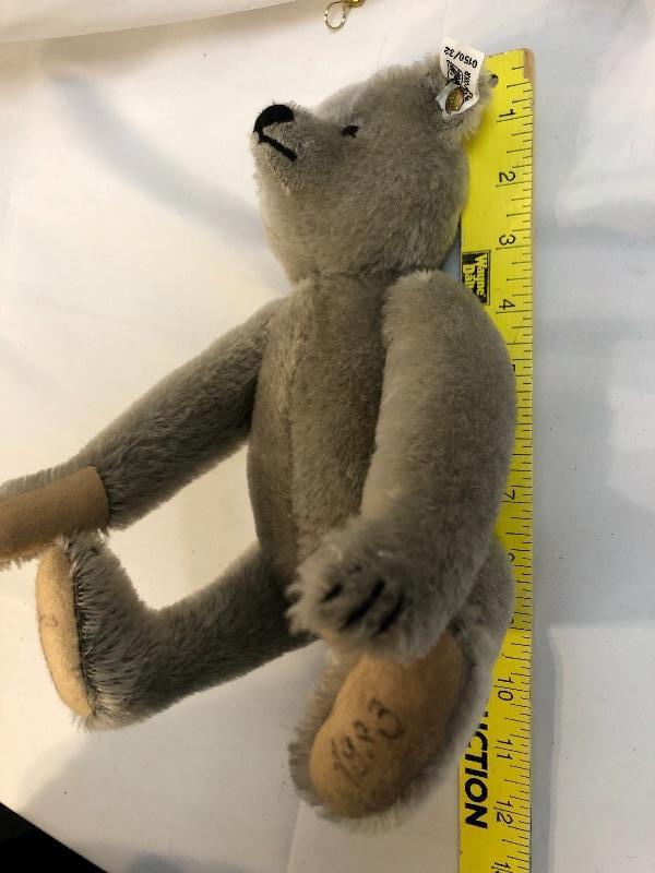 Vintage Steiff teddy bear. Jointed limbs. Feet are designer signed and dated. Has white ear tag, #0150/32.