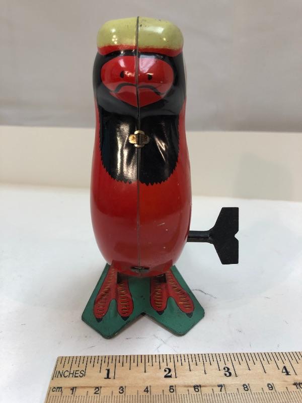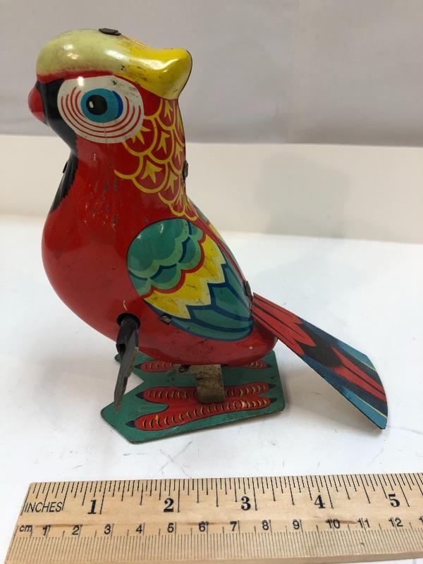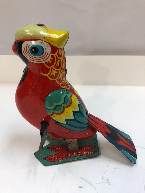 Vintage red macaw wind up tin toy. Colorfully painted parrot. Has key to wind up. Unbranded. About 6" tall. Some signs of age and wear.