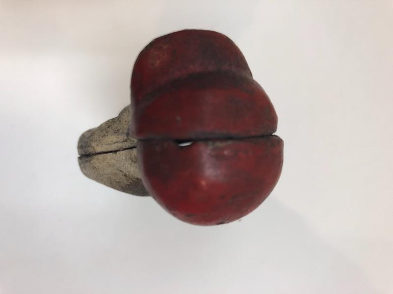 Vintage cast iron baseball player coin bank. Slugger is across the chest. Coin slot in the back.