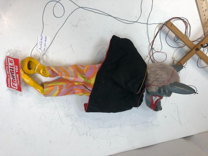 Vintage Pelham Marionette Puppet “The Wolf” 14". The Vintage Pelham Marionette Puppet “The Wolf” 14" is wearing multicolor pants, a black and red cape, and white gloves. His body is plush and his hands, feet, and face are material.