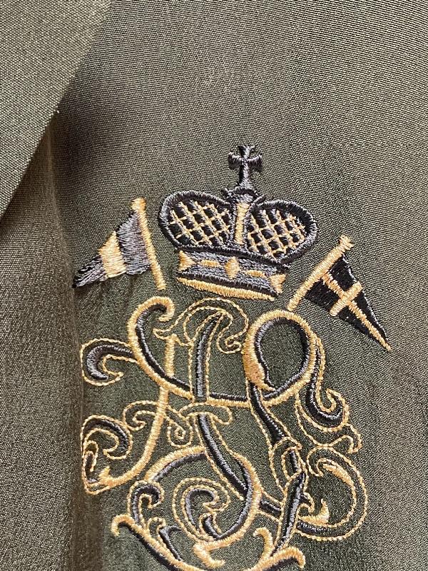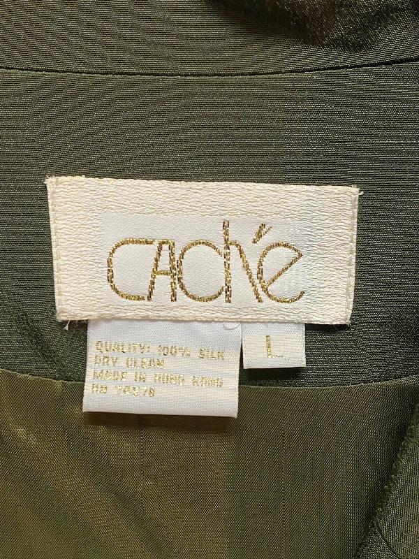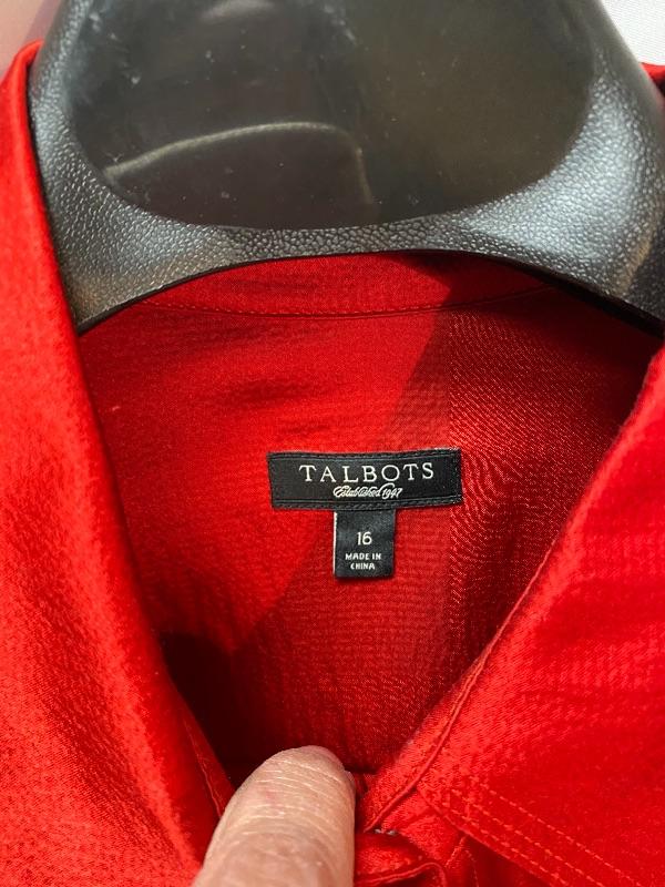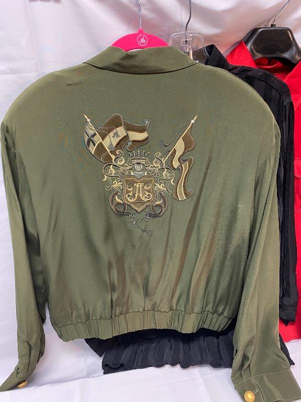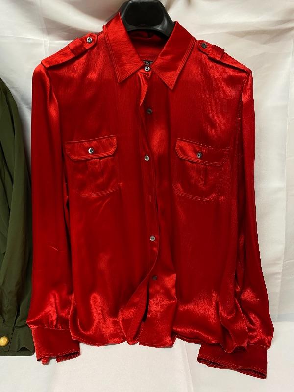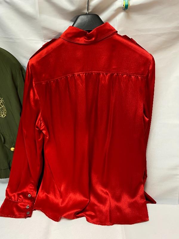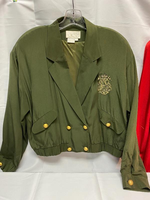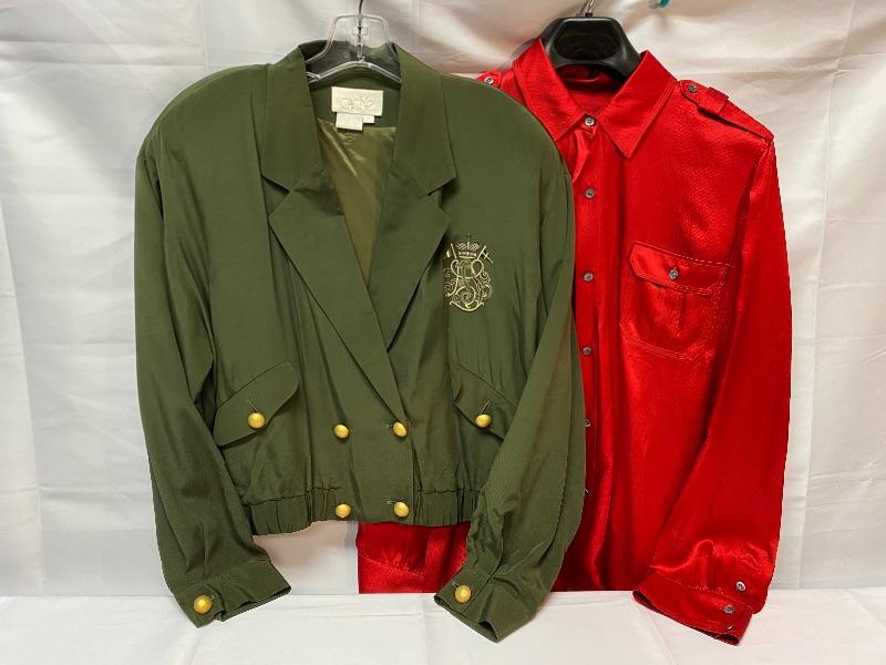 Pair of women's tops. One is from Cache, olive green, flight jacket style, size large. The other is Talbots, red button front blouse, size 16. Both are in good condition.