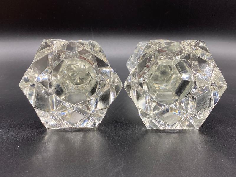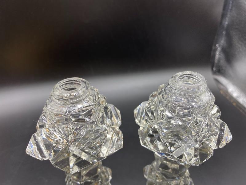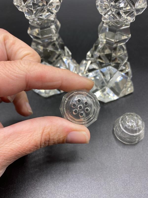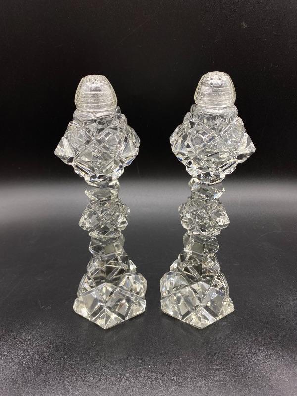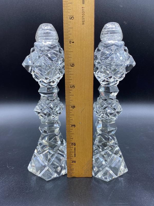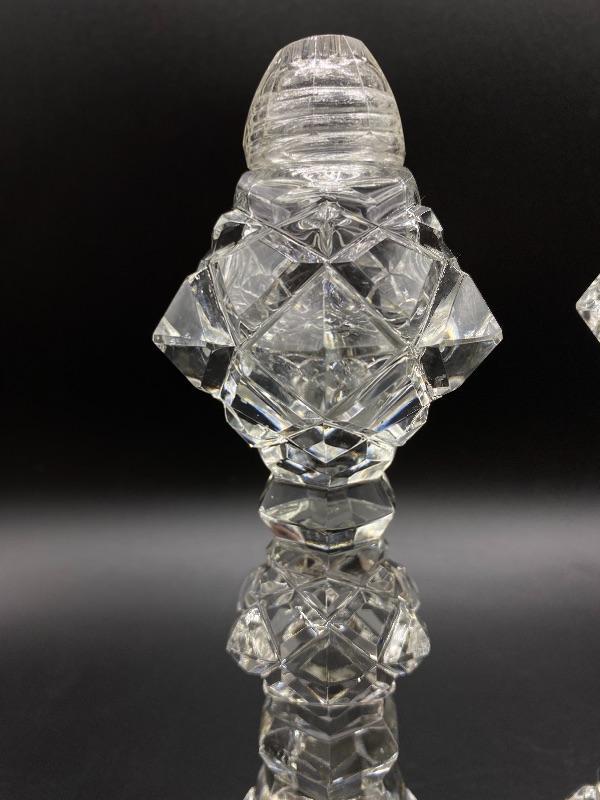 8" crystal salt & pepper shakers. Diamond cut pattern. Heavy glass bottom. In good condition. Caps screw on/off nicely. No chips or damage noted. #24-30001