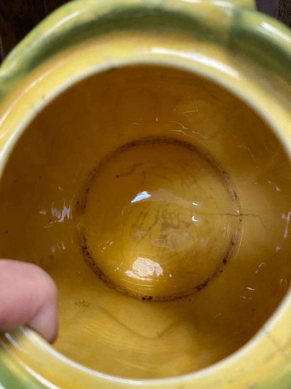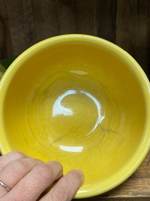 Vintage Shawnee Pottery Corn King dishware in yellow. Lot of 14 pieces. Most pieces are marked. The one covered butter dish is a little pale but more yellow then white. One chip noticed on the inside of one piece and the canister is missing it's lid, otherwise in good vintage condition. #24-30002