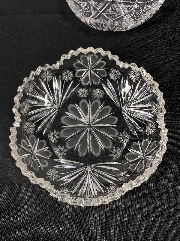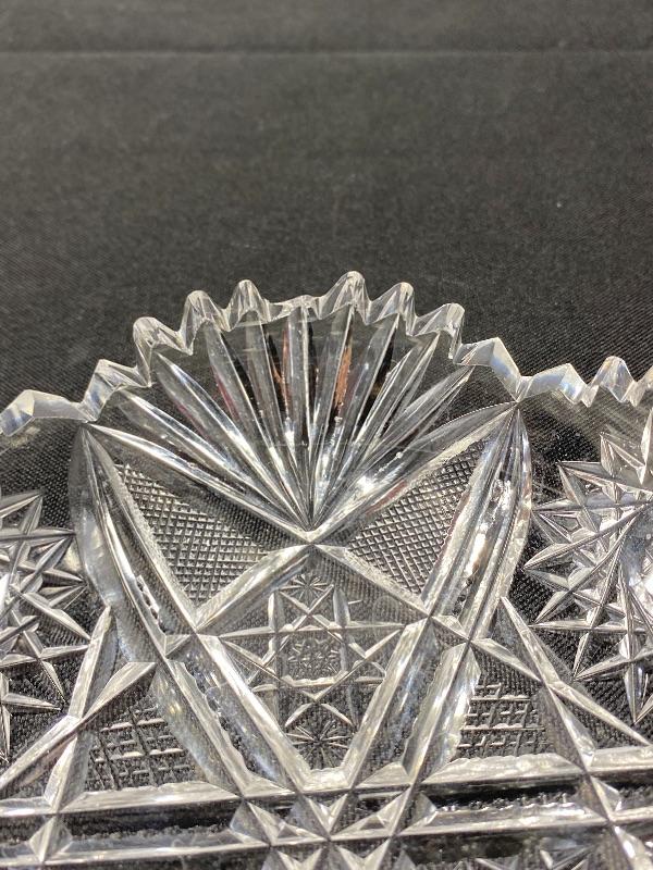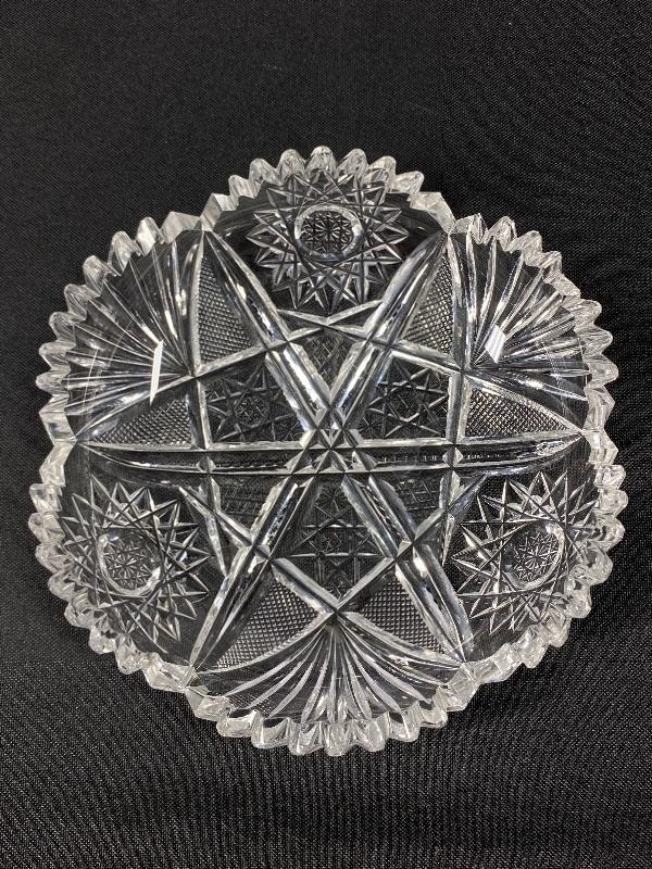 Set of 3 ABP American Brilliant Cut glass bowls. Cut etched crystal, scalloped edge with saw tooth finish. Two have a flower pattern in it, the other star cut pattern. Unfortunately there are a couple chips amongst them that are a bit more noticeable then the average nicks sawtooth gets. 5" to 7" size. Display nice. #24-30014