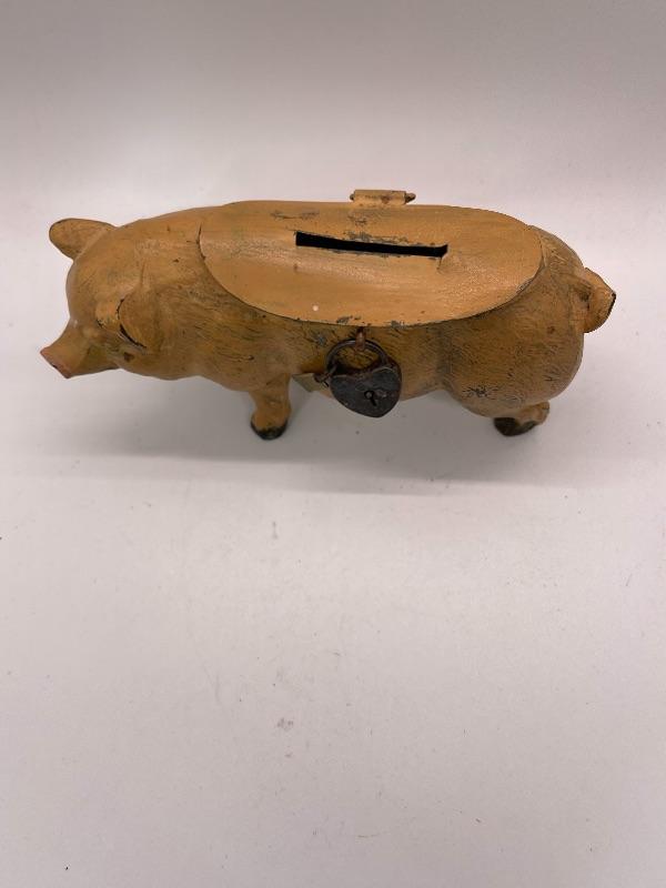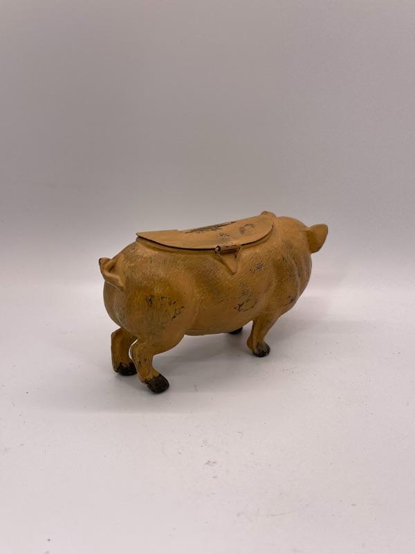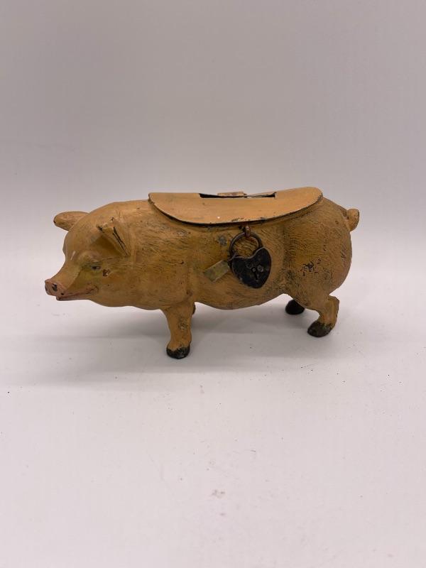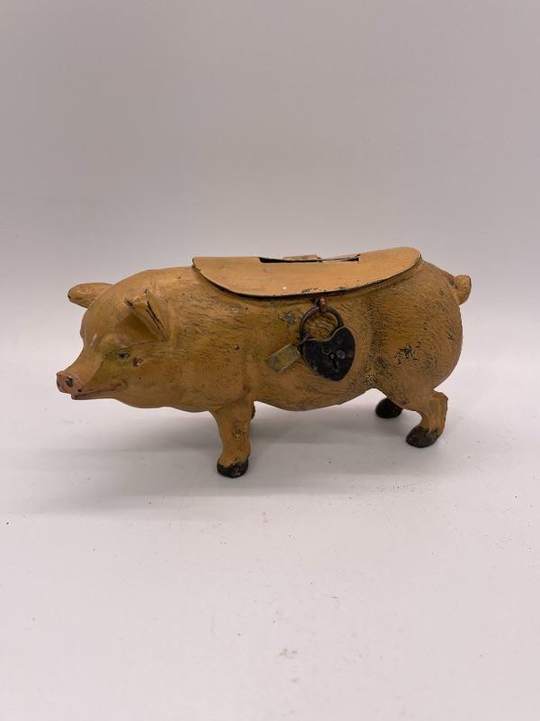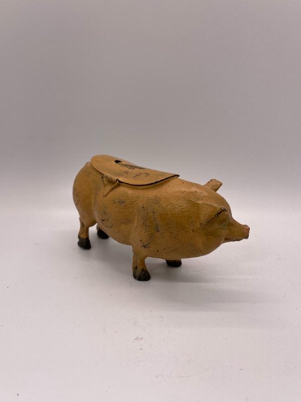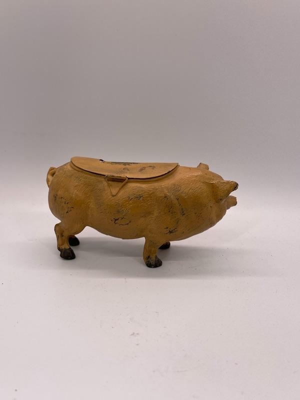Vintage hog piggy bank. Cast metal, maybe pot metal that has been painted. Hinged lid it slot. About 6" length. Unbranded. #020-00532