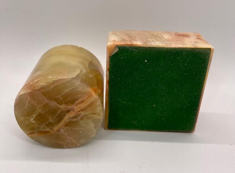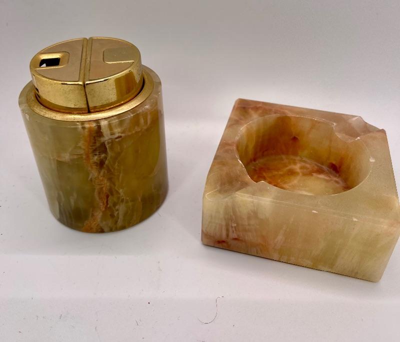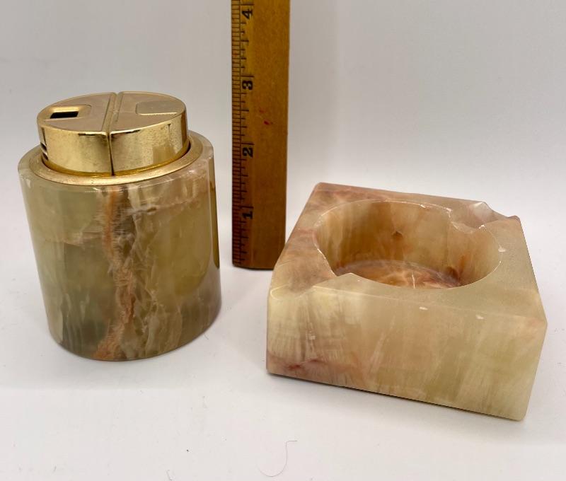 Vintage marble/ carved stone table top lighter and ashtray. About 3" size. Chip in the corner of ashtray.