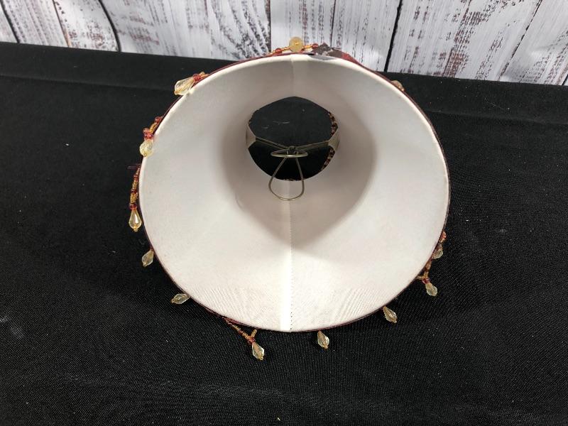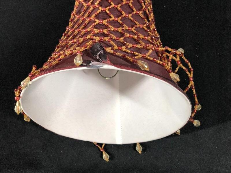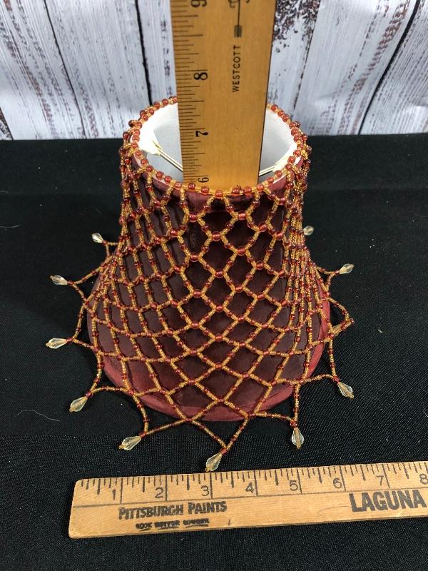 Dark copper red colored beaded lamp shade. Mesh like bead work over the shade with fringe. About 6" size. Clips on to bulb. #028-005