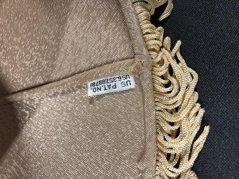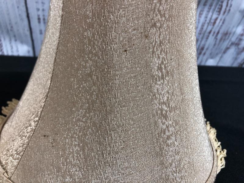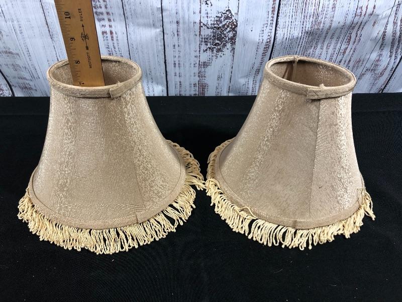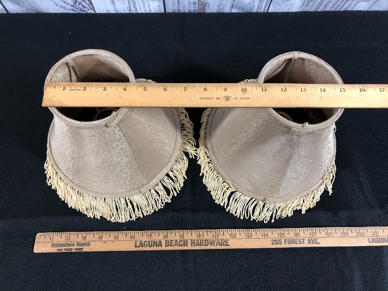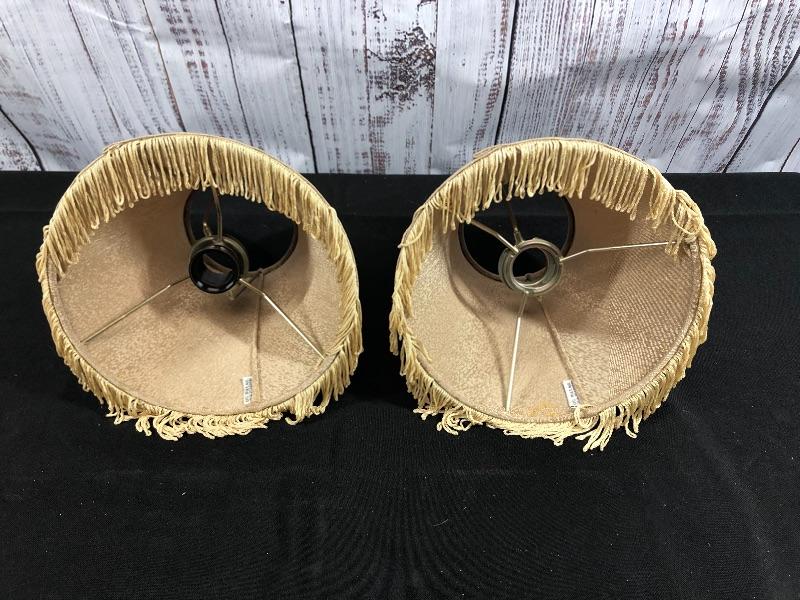 Matching pair of beige lamp shades. Fringed edge. About 8" size. #028-007