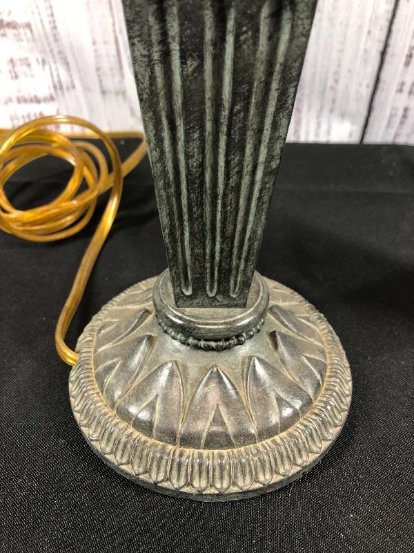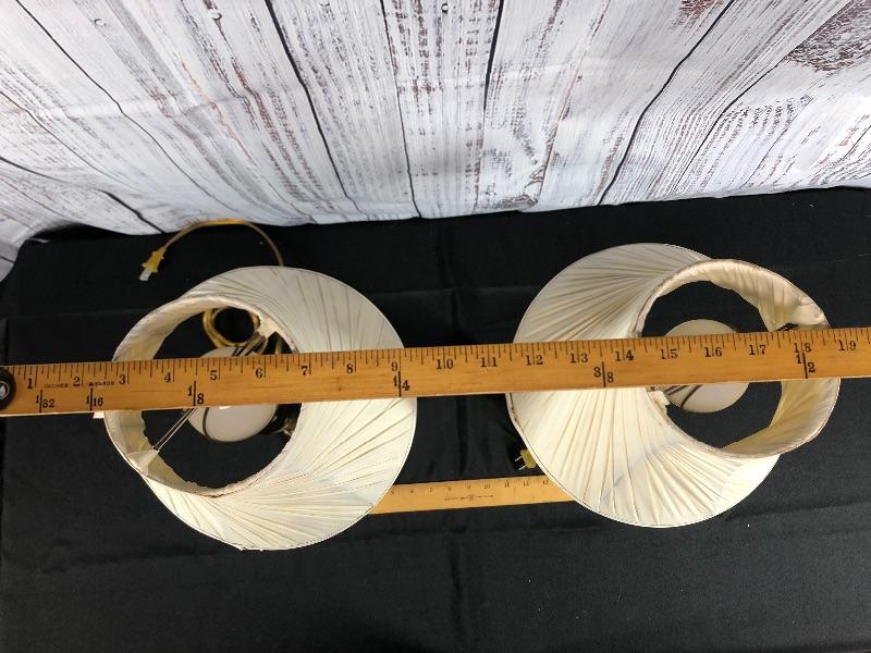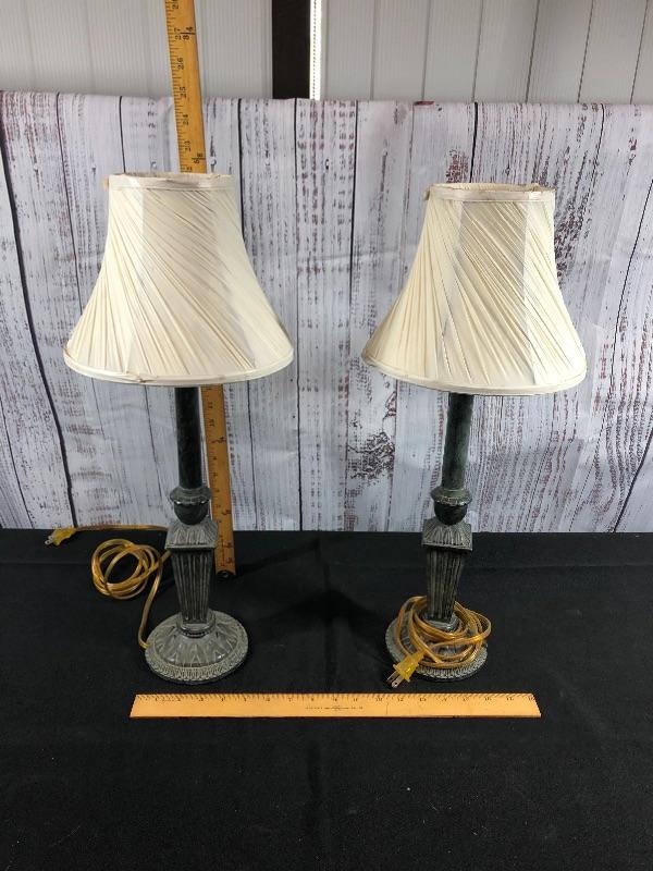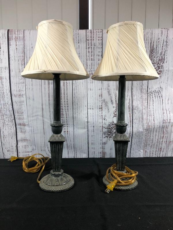 Matching candlestick style table lamps with shades. Black rustic metal finish. Shades have a swirled look. Under 23" with the shade. On/off at the lamp. #028-018