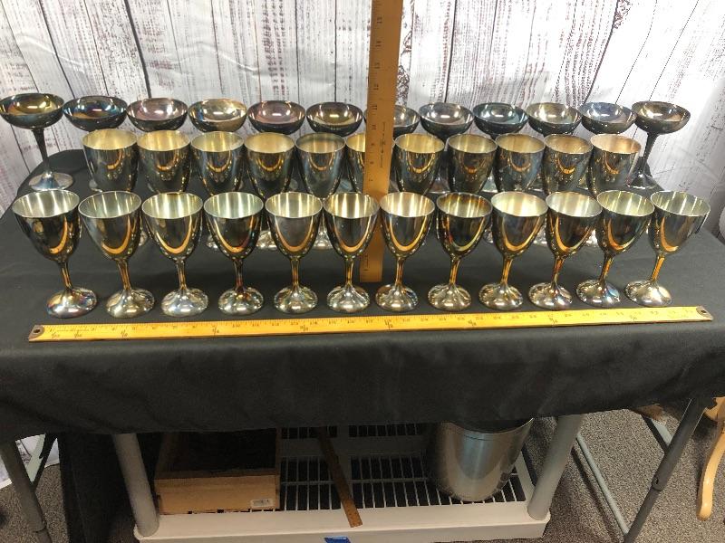 Large set of silver plate wine glasses. Three different styles of goblets. Tarnished. Lot has 35 glasses. #022-0496