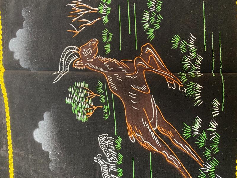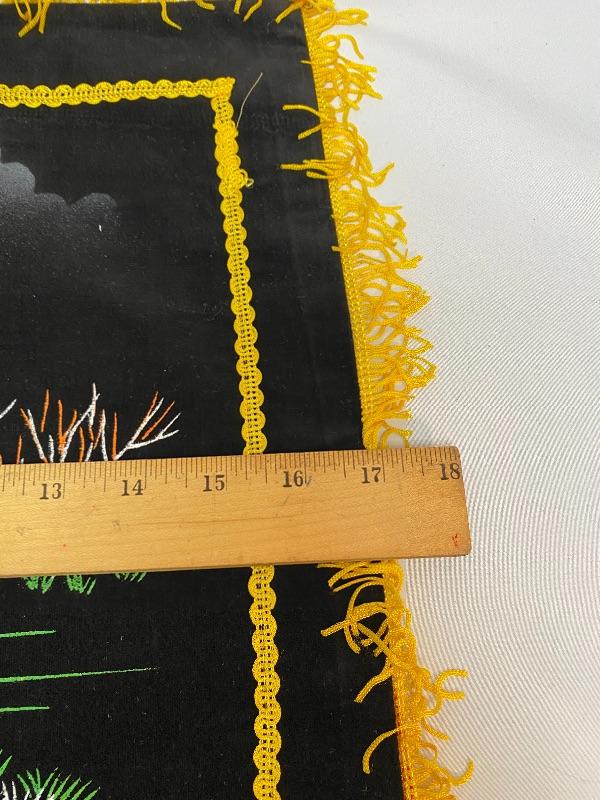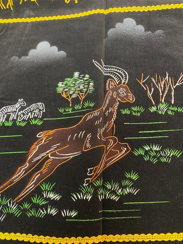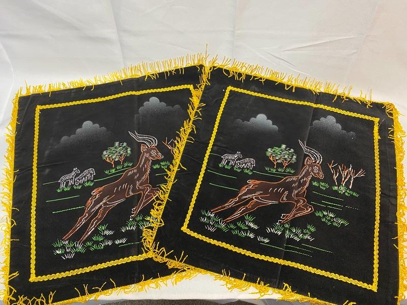 Pair of black velvet pillow cases. Just like black velvet paintings, these probably glow under a black light. Features a gazelle jumping and zebra in the background. Yellow fringed edge. Great vintage condition, probably never actually used.