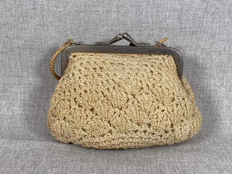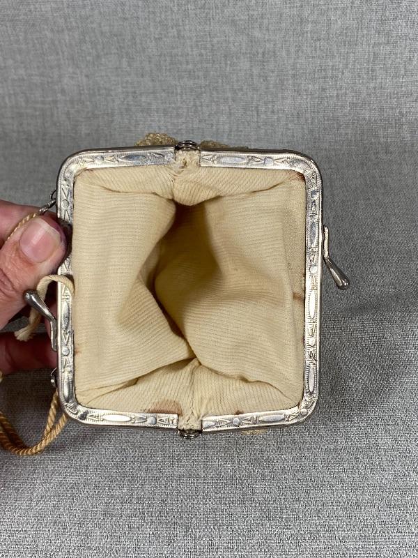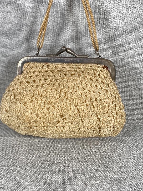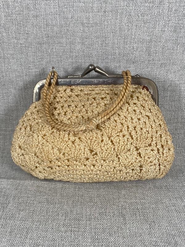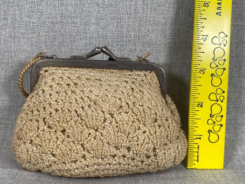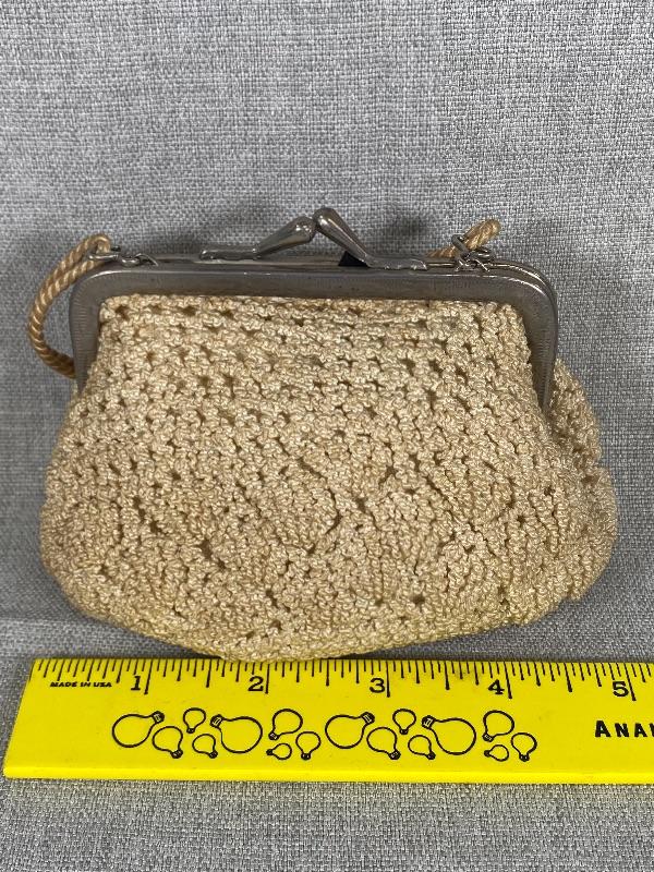 Cute small vintage crochet lace handbag. Measures about 3"x5" size. Light discolor but no obvious spots. #020-00334