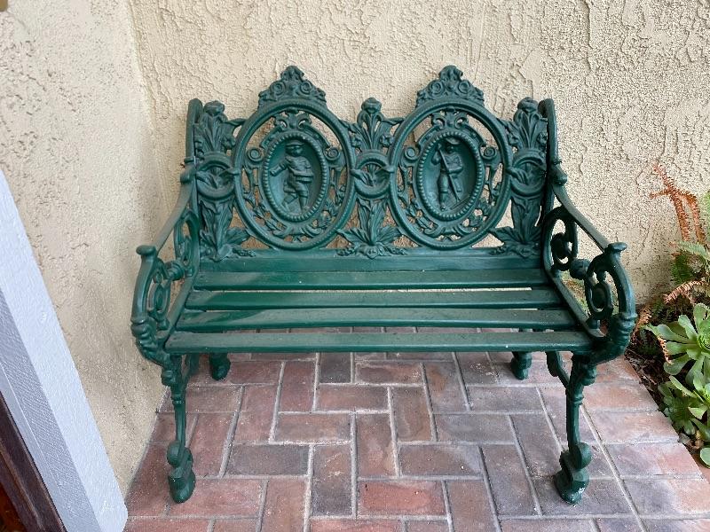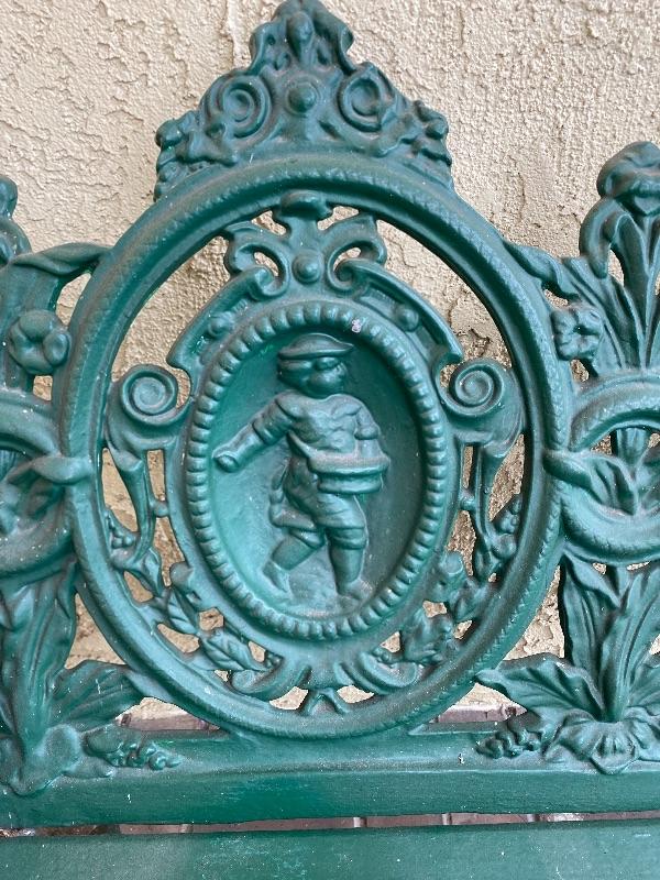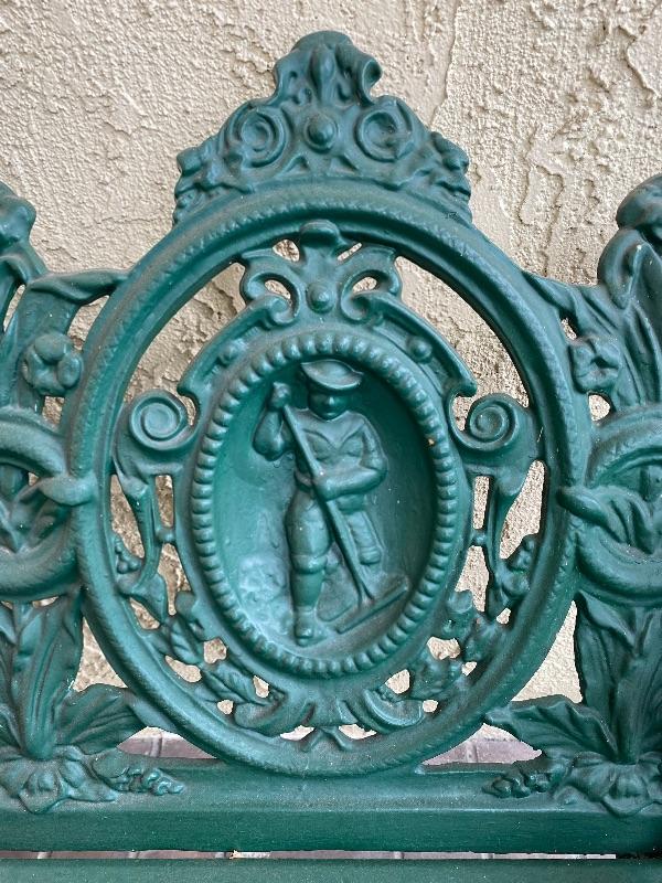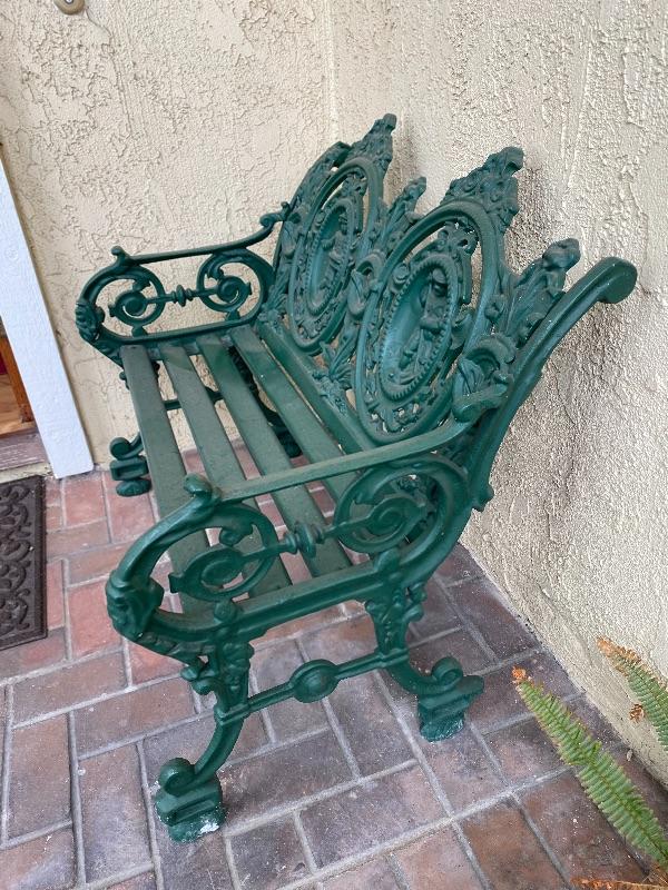 Deep green two seater bench. Cast iron and wood slats. Has an ornate figural back design. Good condition. #24-50028